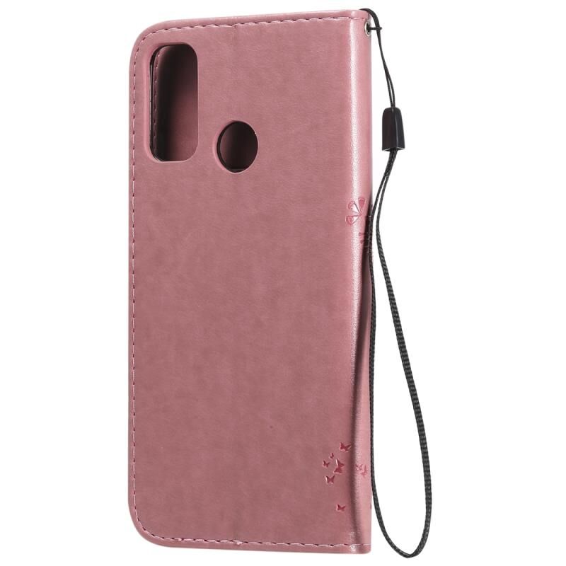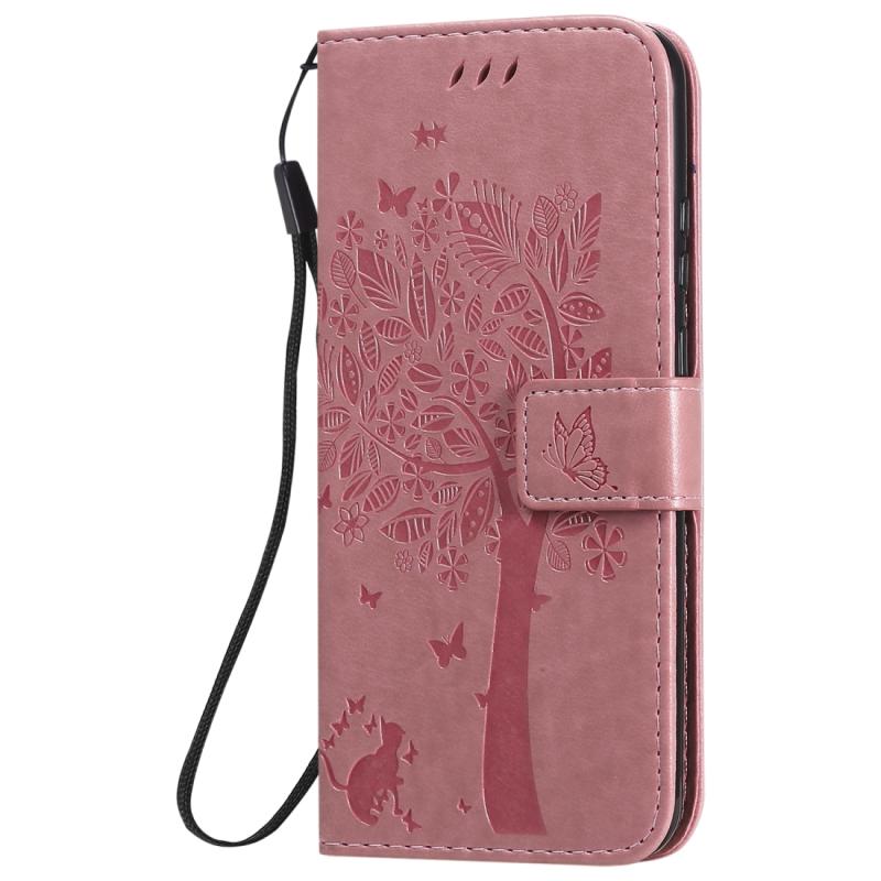Θήκη Huawei P Smart 2020, Δερμάτινη, Οριζόντια, με ανάγλυφο σχέδιο Δέντρου & Γάτας, με βάση στήριξης, θήκες για κάρτες, πορτοφόλι & λουρί (ρόζ)