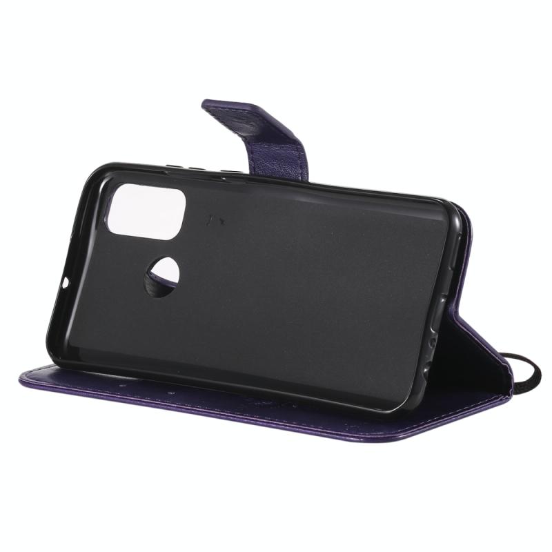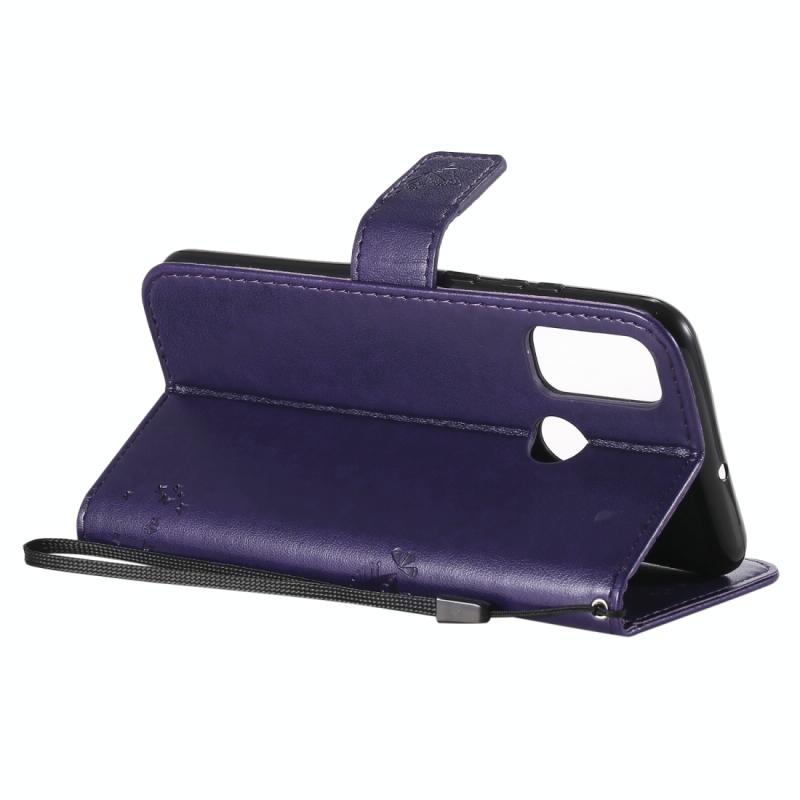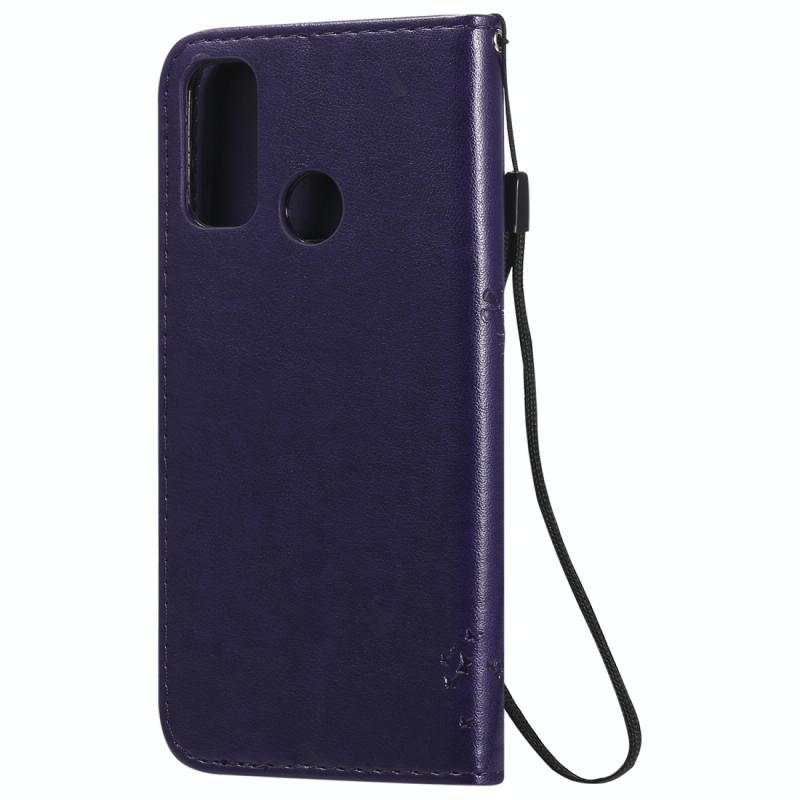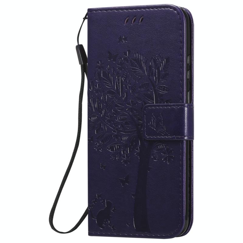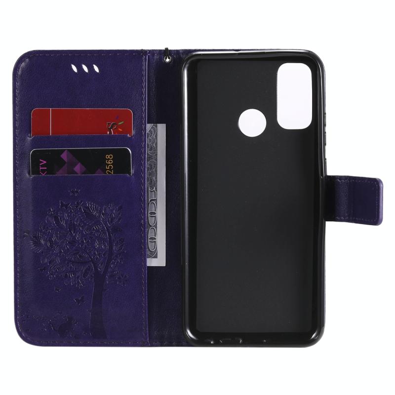 Θήκη Huawei P Smart 2020, Δερμάτινη οριζόντια με ανάγλυφο σχέδιο Δέντρου & Γάτας, με βάση στήριξης, θήκες καρτών, πορτοφόλι & λουρί (Μωβ)