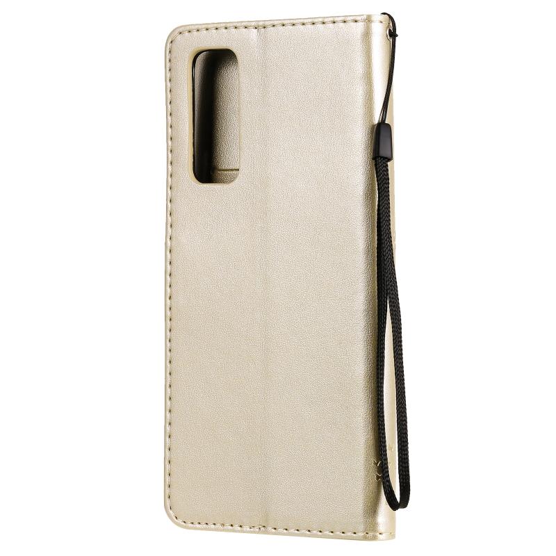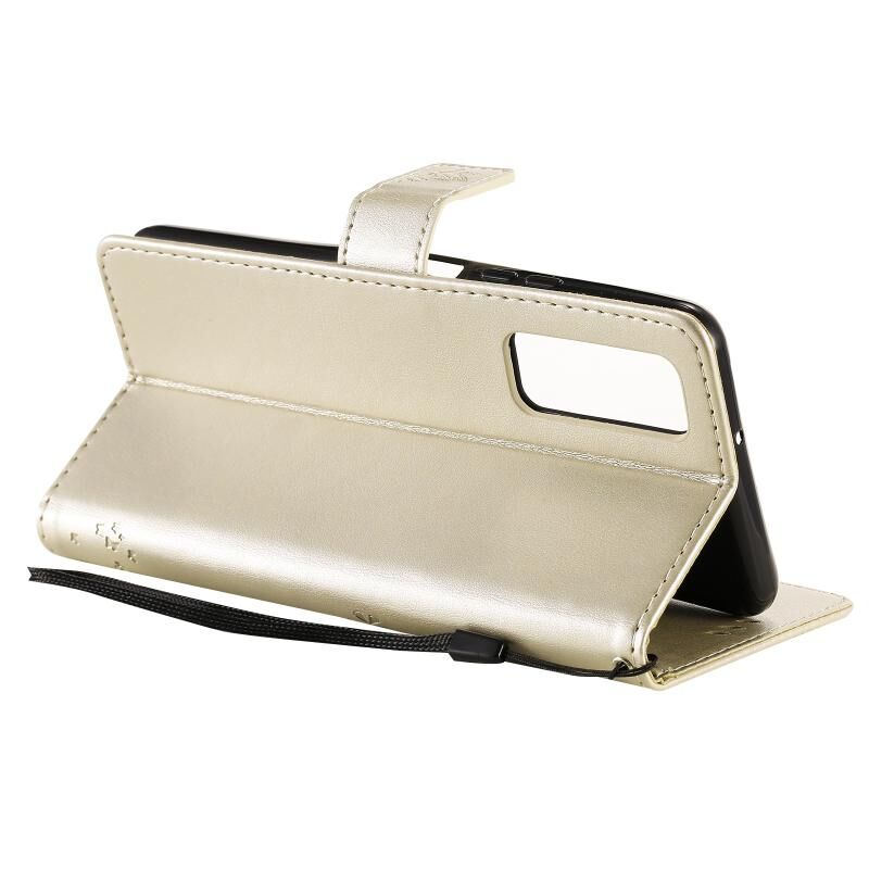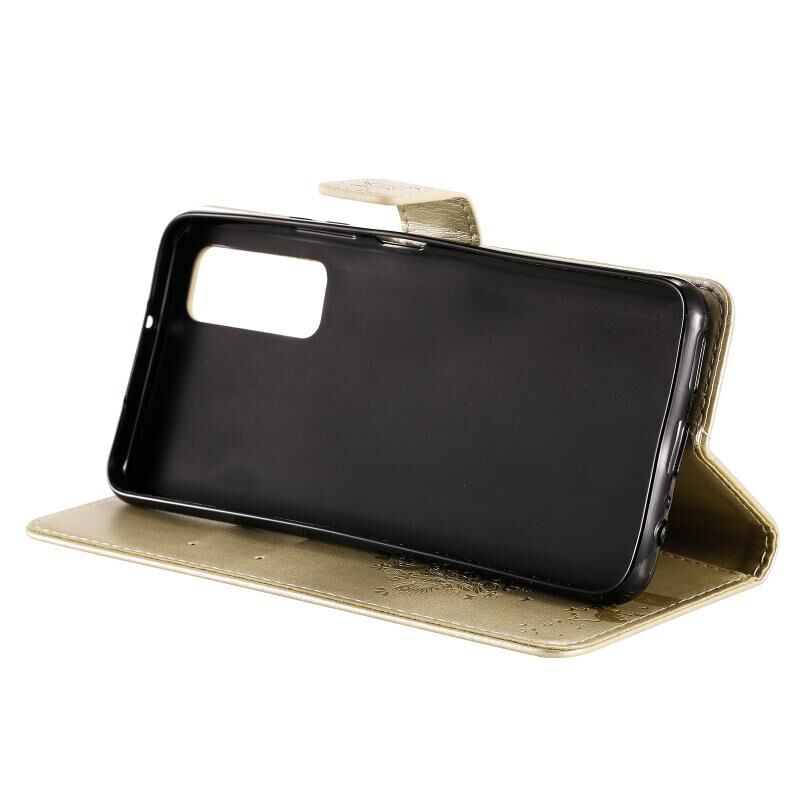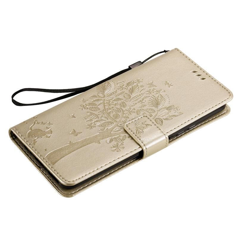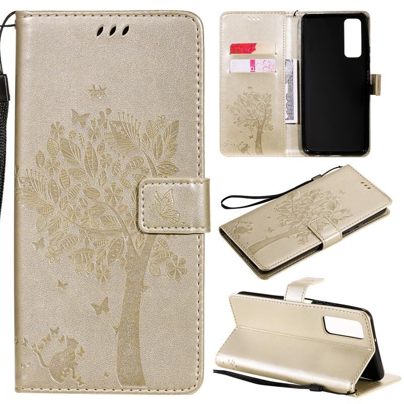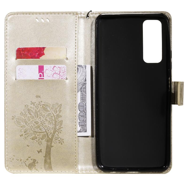 Θήκη Huawei P Smart 2021 με σχέδιο Δέντρου & Γάτας, εκτύπωση με θερμοτύπηση, οριζόντια αναδίπλωση, από δερματίνη PU με βάση στήριξης & θήκες καρτών & πορτοφόλι & κορδόνι (Χρυσό)