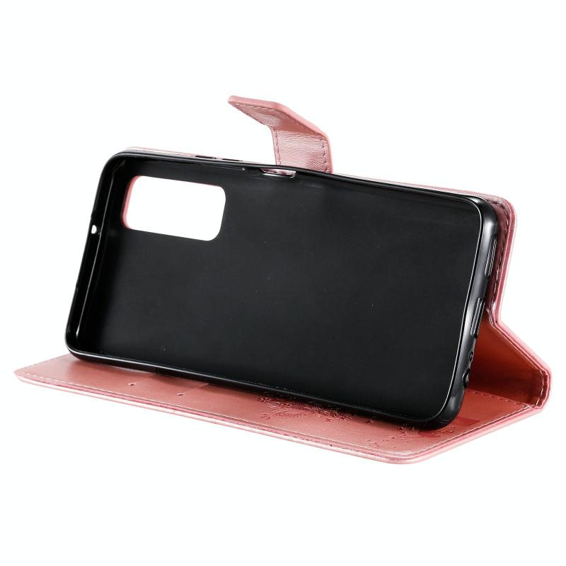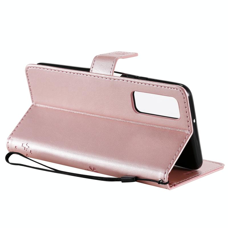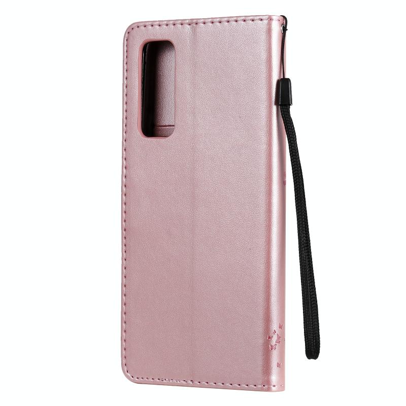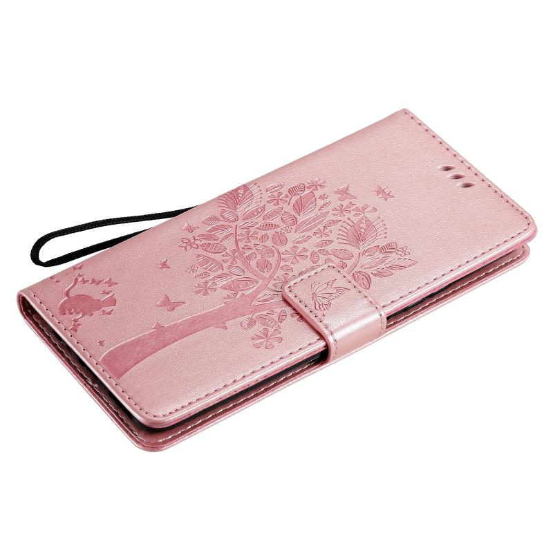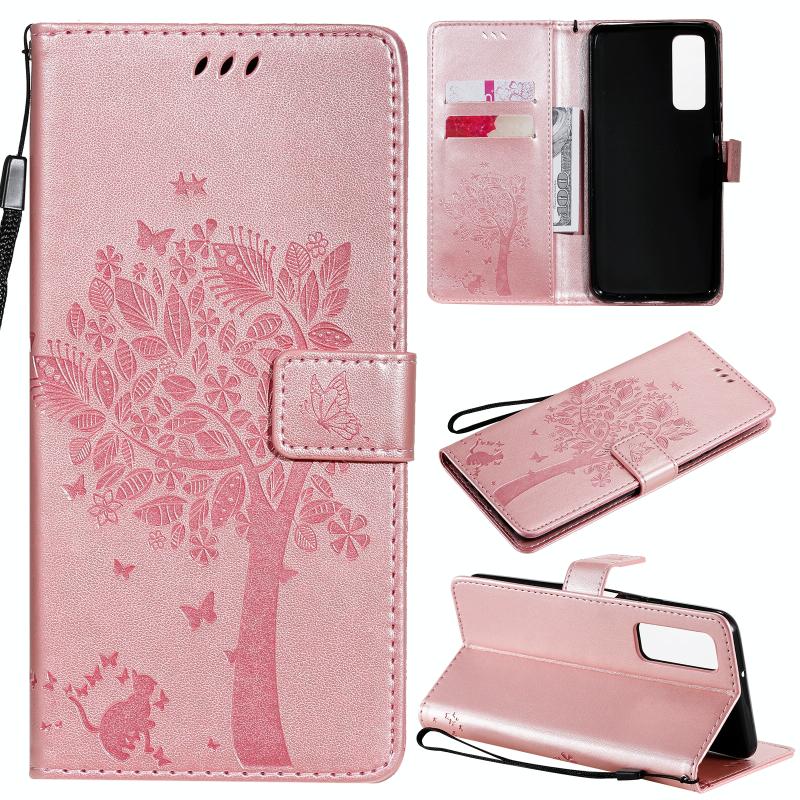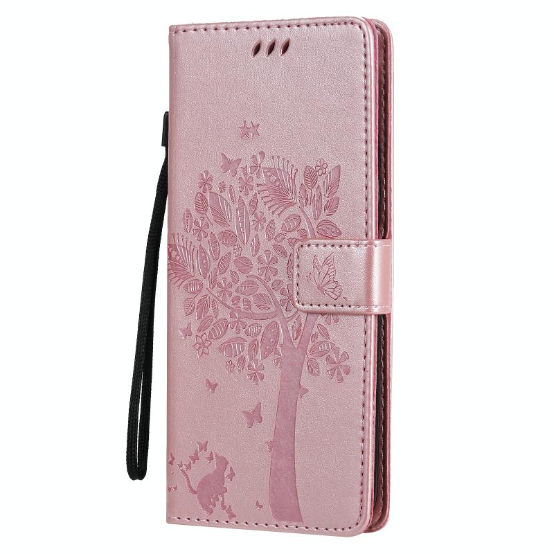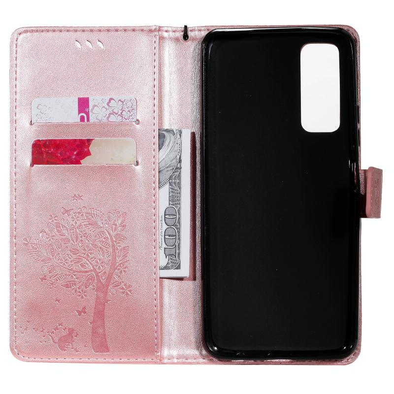 Θήκη Huawei P Smart 2021 με σχέδιο Δέντρου & Γάτας, εκτύπωση με θερμοτύπηση, οριζόντια αναδίπλωση, από δερματίνη PU με βάση στήριξης & θήκες καρτών & πορτοφόλι & κορδόνι (Χρυσό)