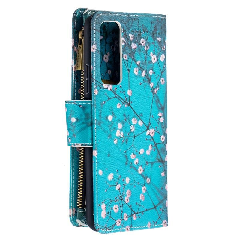 Θήκη δέρματος οριζόντιας αναδίπλωσης με φερμουάρ και σχέδιο ζωγραφικής για Huawei P smart 2021 / Y7a με βάση στήριξης & υποδοχές καρτών & πορτοφόλι (Λουλούδι Δαμασκηνιάς)
