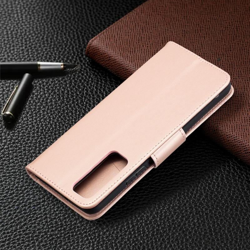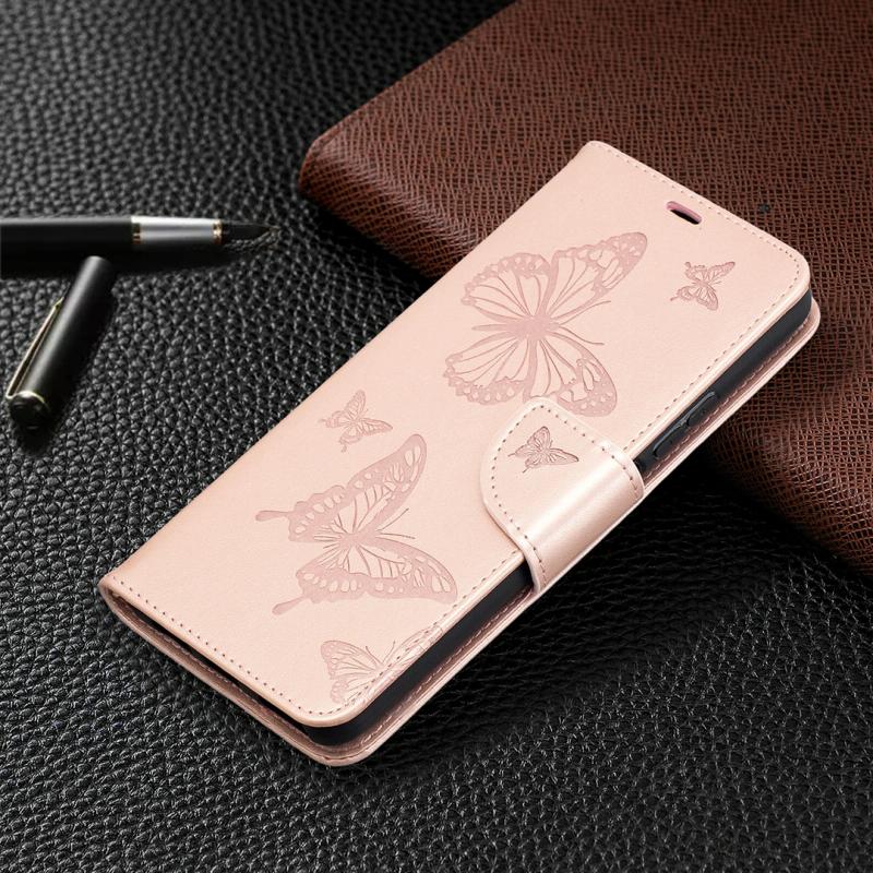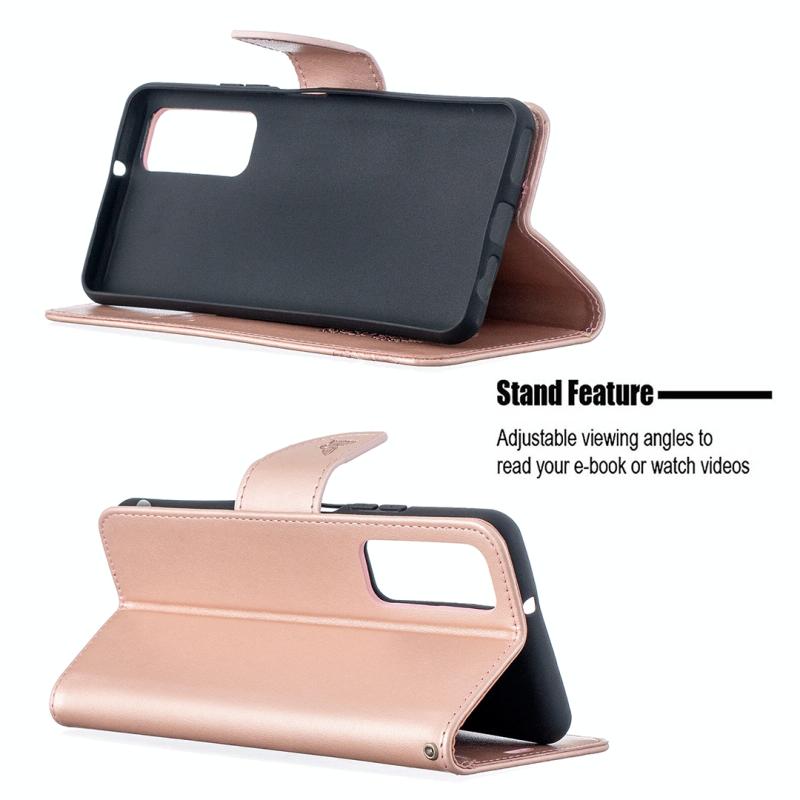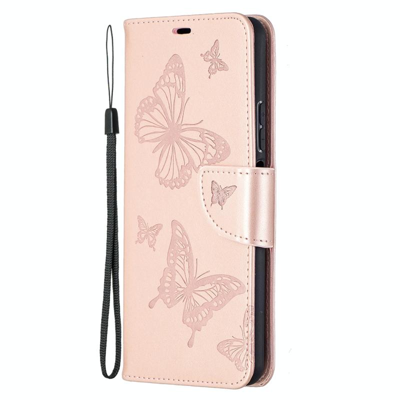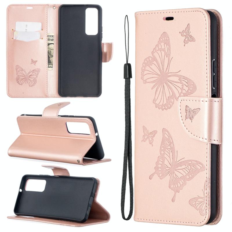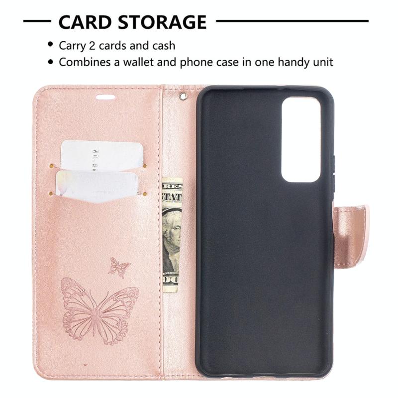 Θήκη Huawei P smart 2021 / Y7a Δερμάτινη οριζόντια με σχέδιο ανάγλυφου πεταλούδας, με βάση στήριξης, θήκη για κάρτες, πορτοφόλι & λουρί (Χρυσό ροζ)