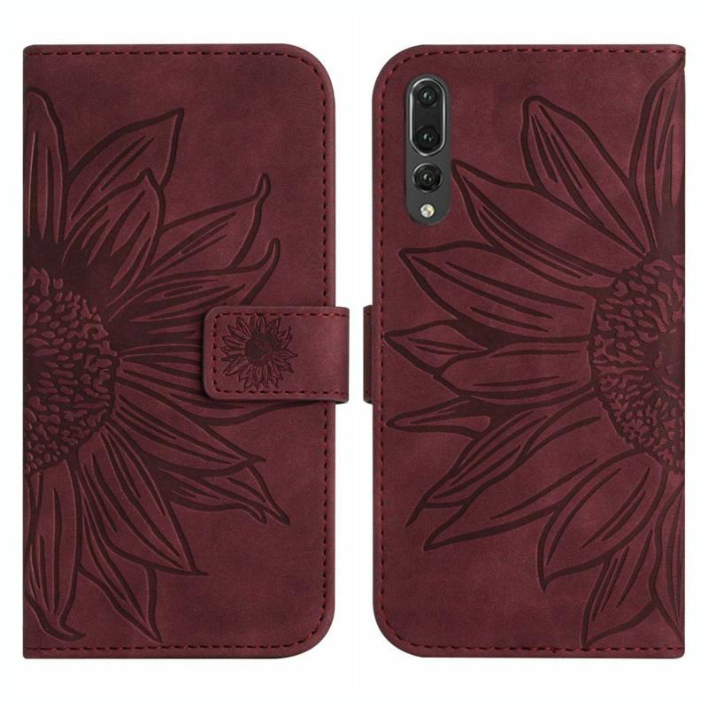 Θήκη τηλεφώνου Huawei P20 Pro με δερμάτινη υφή, σχέδιο ηλίανθου, τύπου flip με κορδόνι (Κόκκινο Ρόδι)