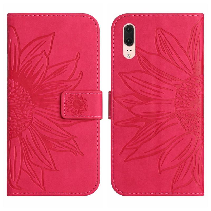 Θήκη τηλεφώνου Huawei P20 με δερμάτινη υφή, σχέδιο ηλίανθου, τύπου flip με κορδόνι (Σκούρο Μωβ)