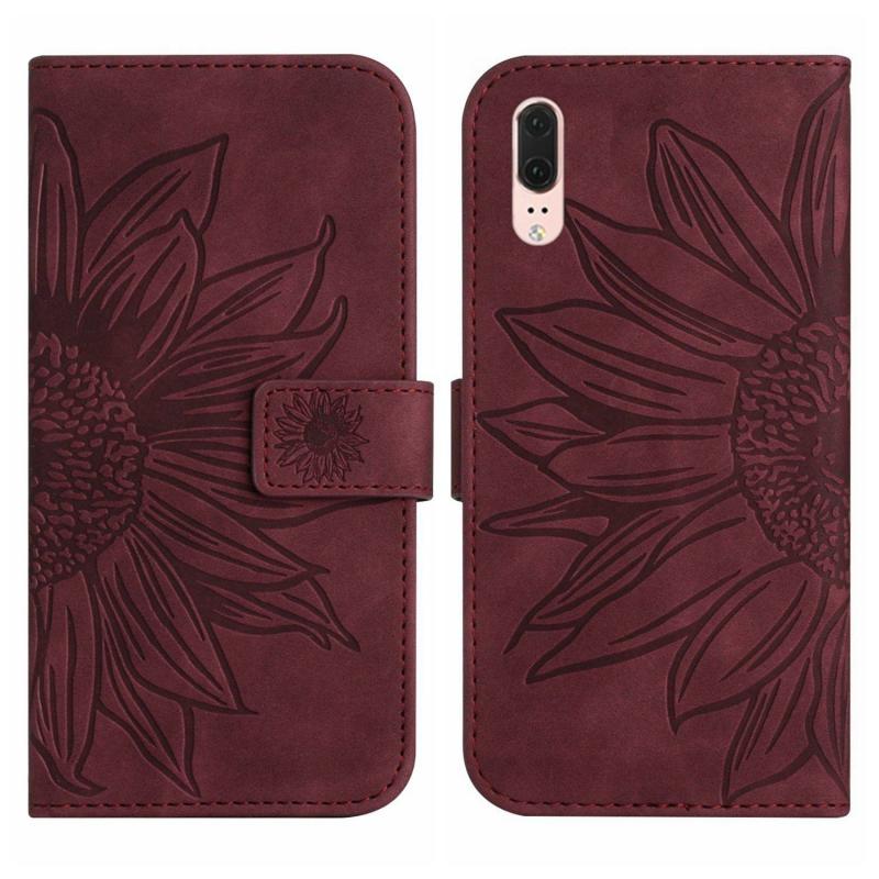 Θήκη τηλεφώνου Huawei P20 με δερμάτινη υφή, σχέδιο ηλίανθου, τύπου flip με κορδόνι (Κόκκινο κρασί)