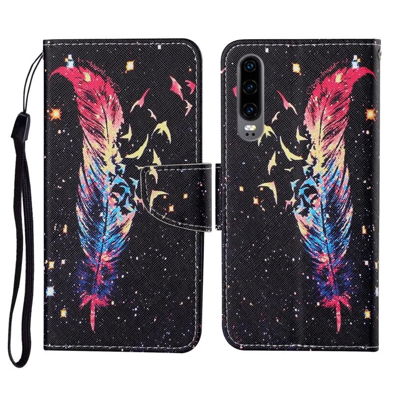 Θήκη δέρματος οριζόντιας αναδίπλωσης με σχέδιο ζωγραφικής, για Huawei P30, με βάση στήριξης, θήκες καρτών, πορτοφόλι και κορδόνι (Φτερό).