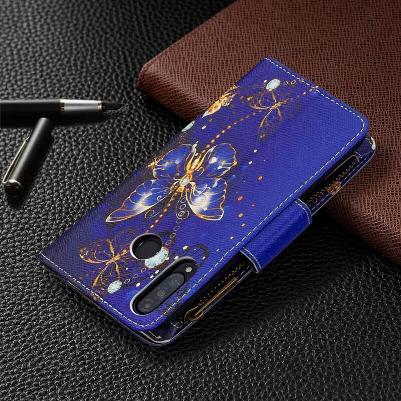 Θήκη Huawei P30 Lite με έγχρωμο σχέδιο, οριζόντια αναδιπλούμενη από δέρμα με φερμουάρ, βάση στήριξης & θήκες για κάρτες & πορτοφόλι (Μωβ Πεταλούδα)