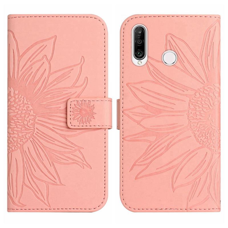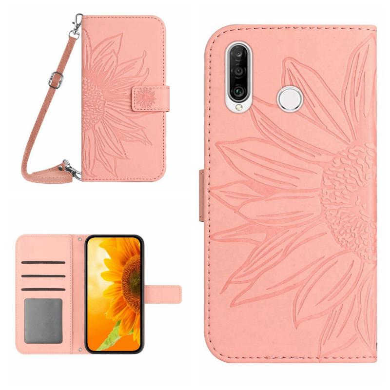Θήκη τηλεφώνου Huawei P30 Lite με αίσθηση δέρματος, σχέδιο ηλίανθου, τύπου flip με λουρί (Κόκκινο κρασί)