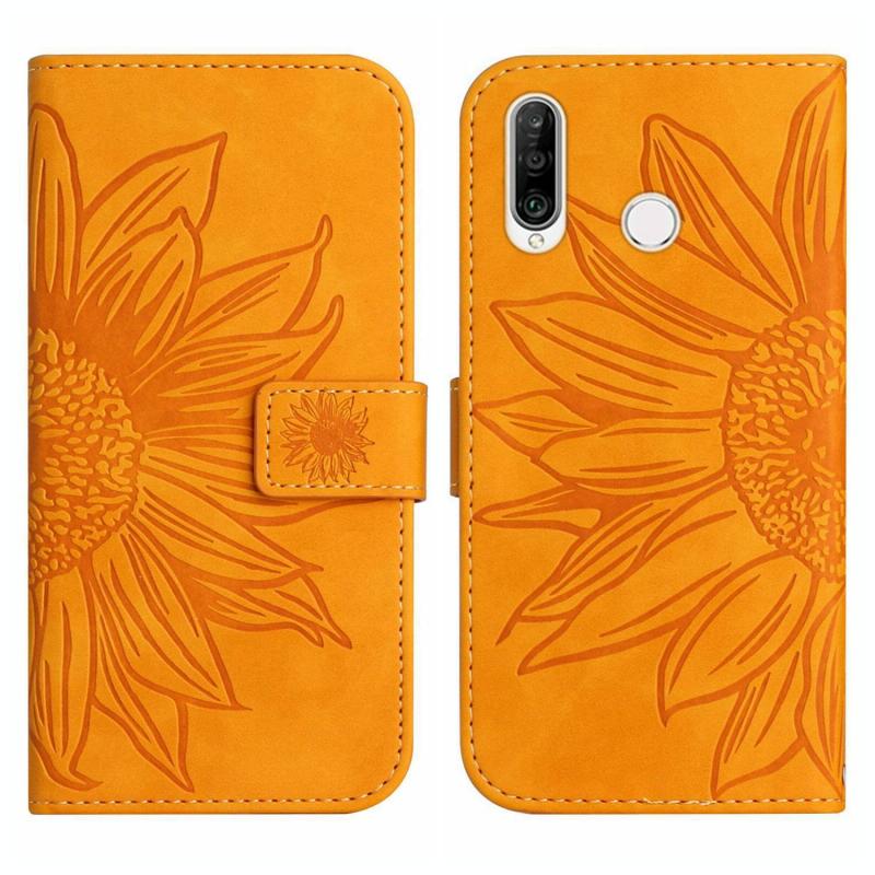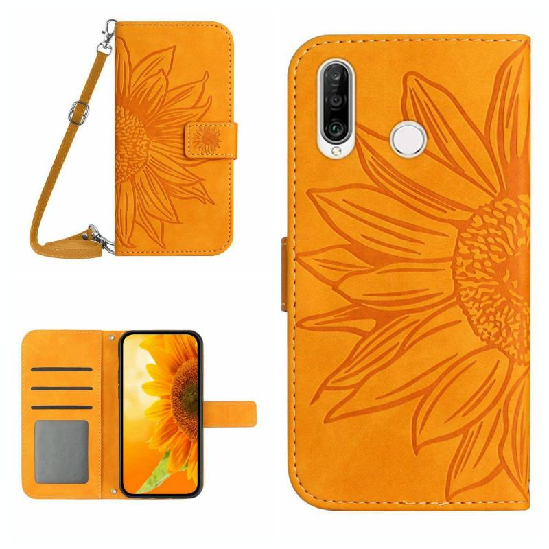 Θήκη τηλεφώνου Huawei P30 Lite με αίσθηση δέρματος, σχέδιο ηλίανθου, τύπου flip με λουρί (Σκούρο Μωβ)