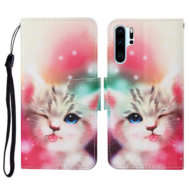 Θήκη δέρματος οριζόντιας αναδίπλωσης με σχέδιο πολύχρωμης ζωγραφικής για Huawei P30 Pro με βάση στήριξης & υποδοχές καρτών & πορτοφόλι & κορδόνι (Γατοειδές με στραβισμό)