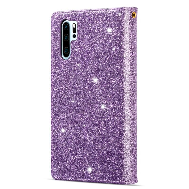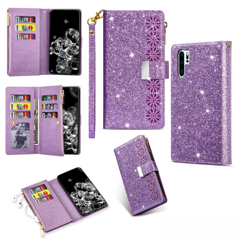 Θήκη δέρματος οριζόντιας αναδίπλωσης με φερμουάρ, γυαλιστερή, με χάραξη λέιζερ αστρικού ουρανού, για Huawei P30 Pro, με πολλαπλές θήκες καρτών, βάση στήριξης, πορτοφόλι & λουρί (Μωβ)