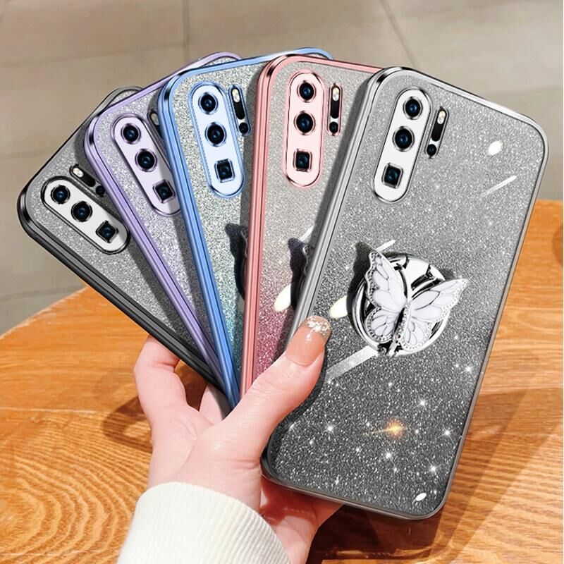 Θήκη κινητού τηλεφώνου Huawei P30 Pro με επιμετάλλωση, διαβαθμισμένη λάμψη, σχέδιο πεταλούδας, από TPU (Ασημί)