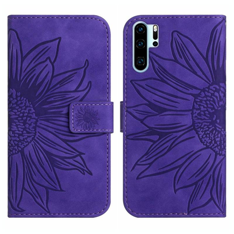 Θήκη τηλεφώνου Huawei P30 Pro με δερμάτινη υφή, σχέδιο ηλίανθου, τύπου flip με κορδόνι (Σκούρο μωβ)