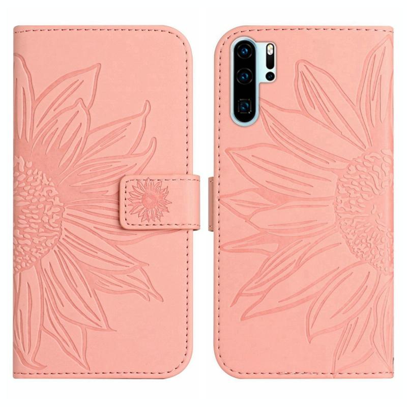 Θήκη τηλεφώνου Huawei P30 Pro με δερμάτινη υφή, σχέδιο ηλίανθου, τύπου flip με κορδόνι (ρόζ)