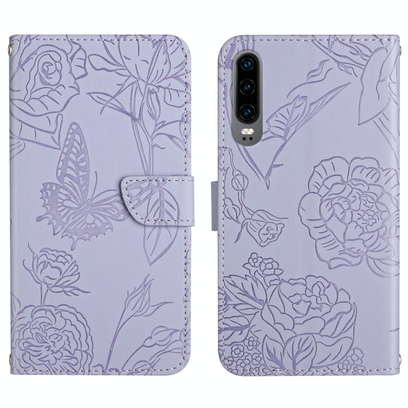 For Huawei P30 Skin Feel Butterfly Peony Embossed Leather Phone Case(Purple)