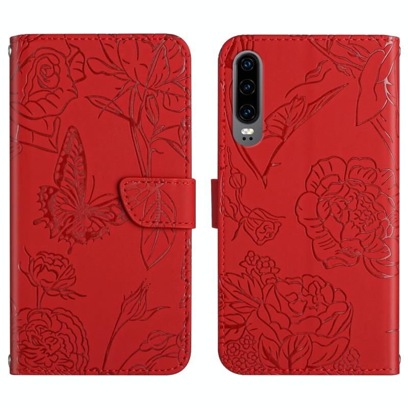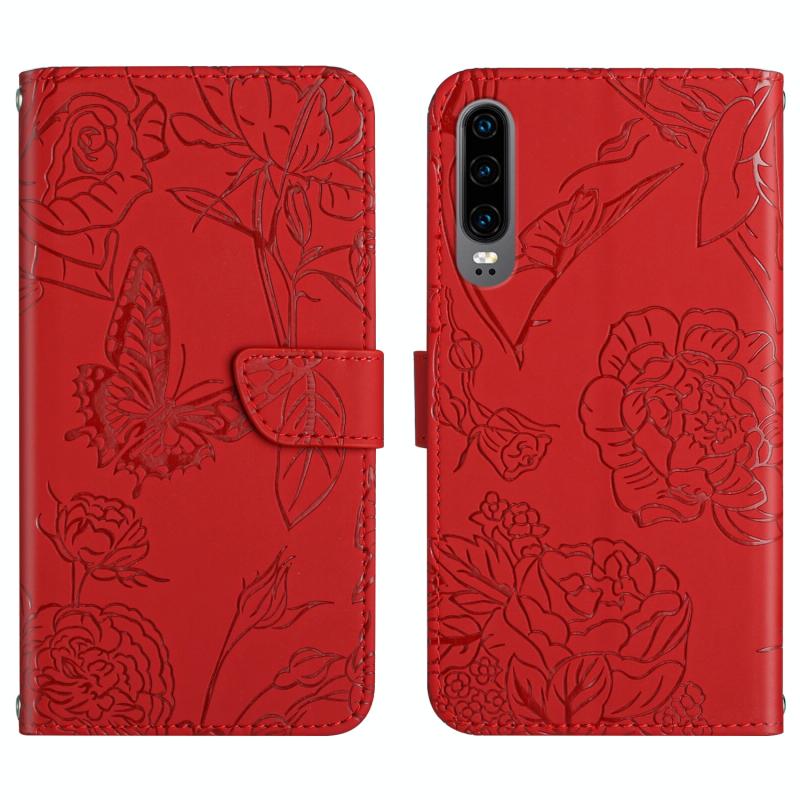 For Huawei P30 Skin Feel Butterfly Peony Embossed Leather Phone Case(Red)