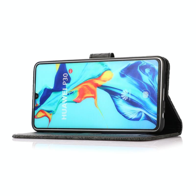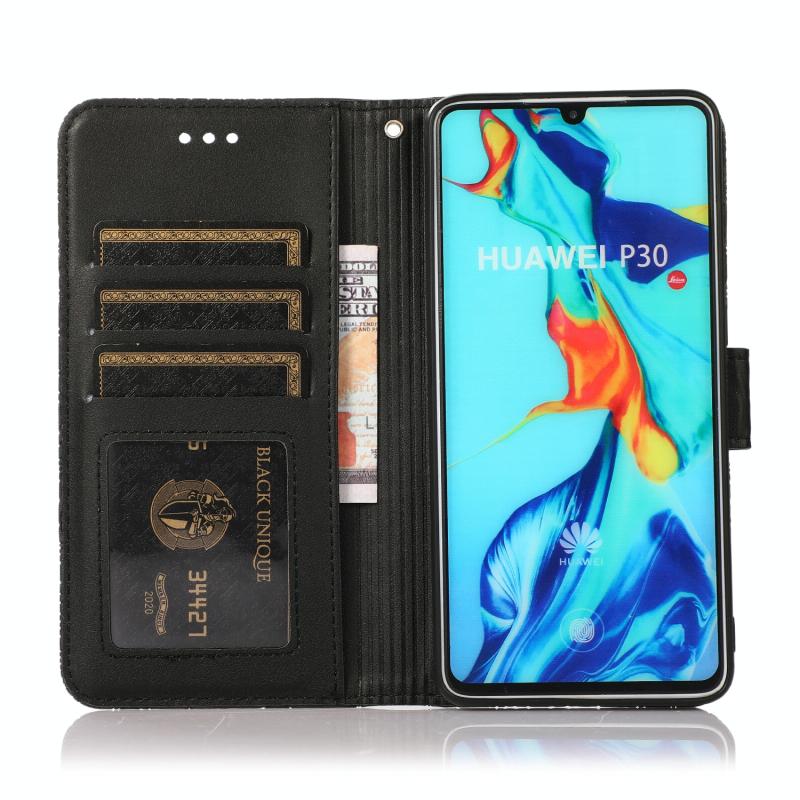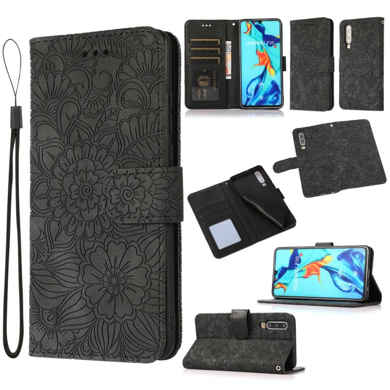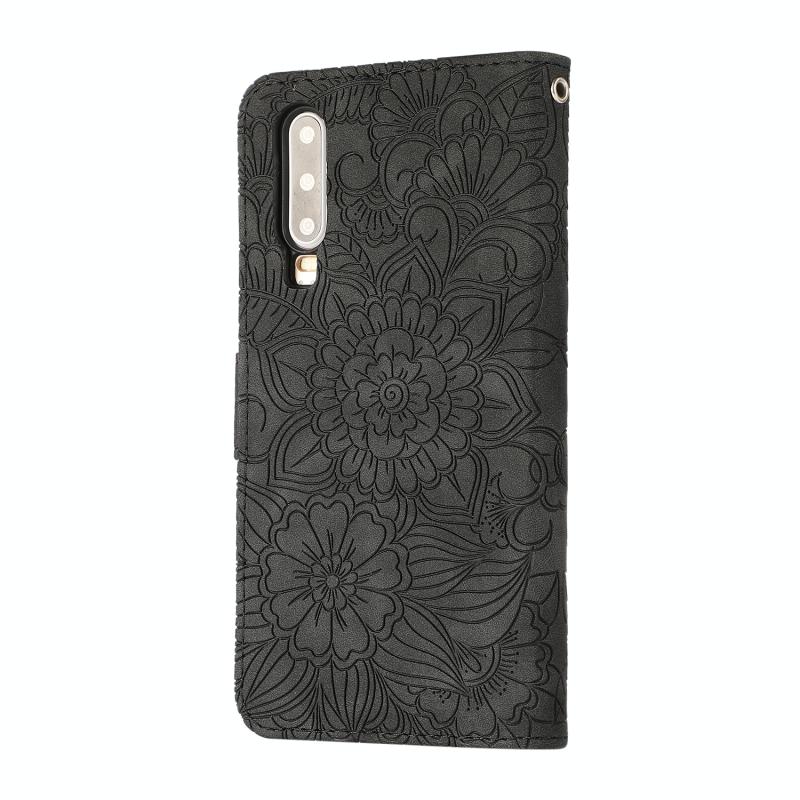 Θήκη Huawei P30 με υφή δέρματος, ανάγλυφο ηλιοτρόπιο, οριζόντια, με βάση στήριξης, θήκες για κάρτες, πορτοφόλι & λουρί (Μαύρο)