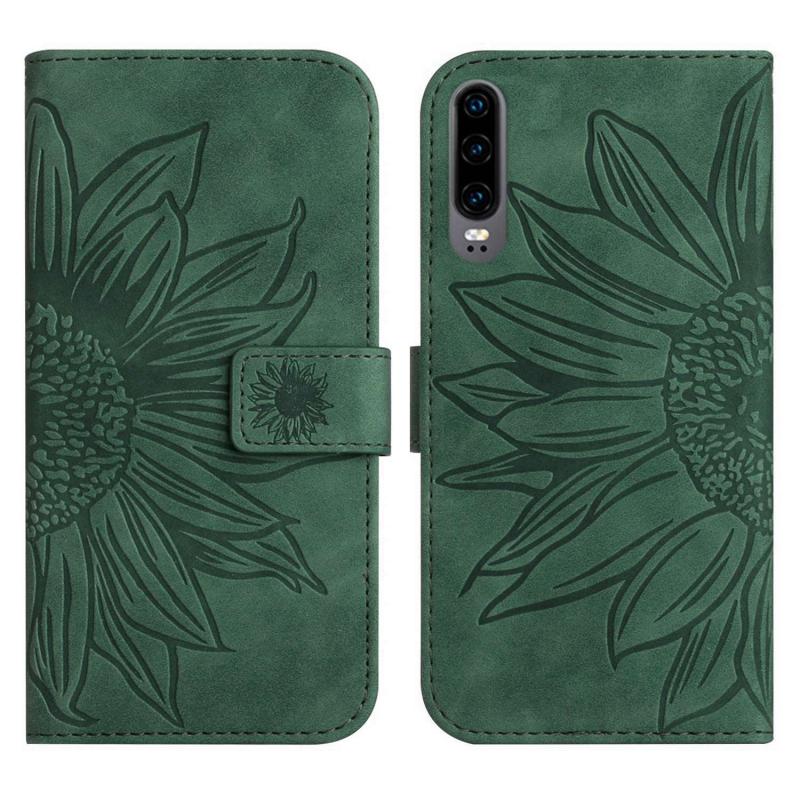 Θήκη τηλεφώνου Huawei P30 με αίσθηση δέρματος, σχέδιο ηλίανθου, τύπου flip με λουρί (πράσινο)