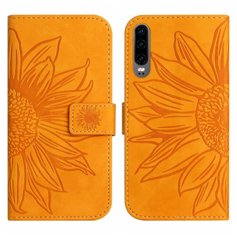 Θήκη τηλεφώνου Huawei P30 με αίσθηση δέρματος, σχέδιο ηλίανθου, τύπου flip με λουρί (Κίτρινο)
