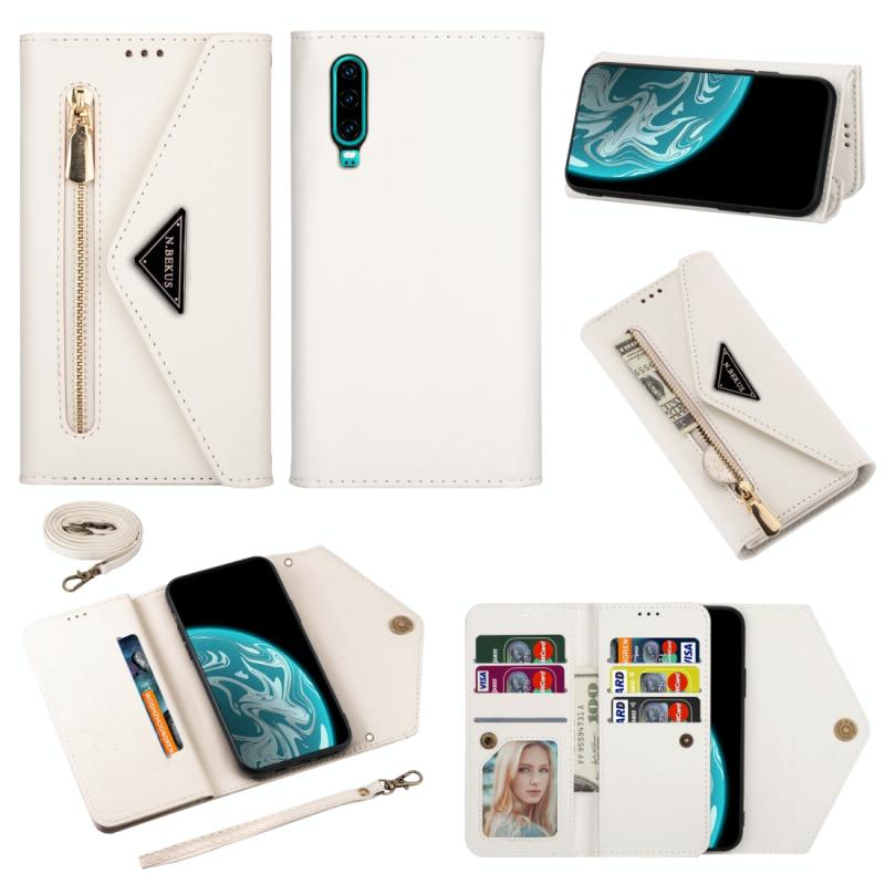 For Huawei P30 Skin Feel Zipper Horizontal Flip Leather Case with Holder & Card Slots & Photo Frame & Lanyard & Long Rope(White)