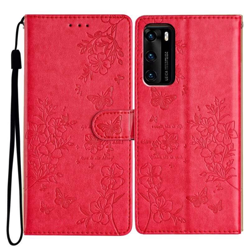 Θήκη τηλεφώνου Huawei P40 Butterflies And Flowers από δέρμα (Χρυσό)
