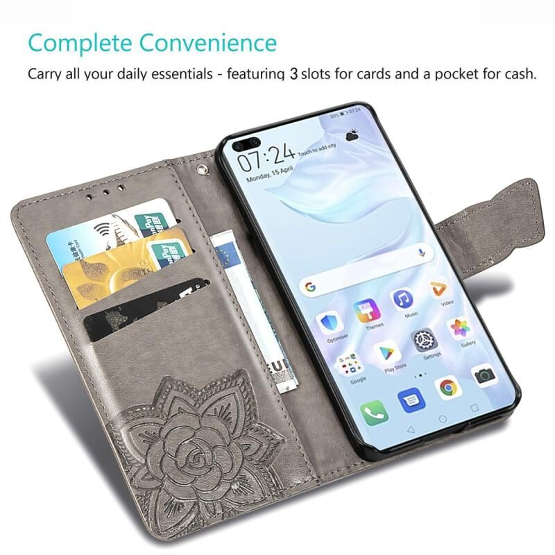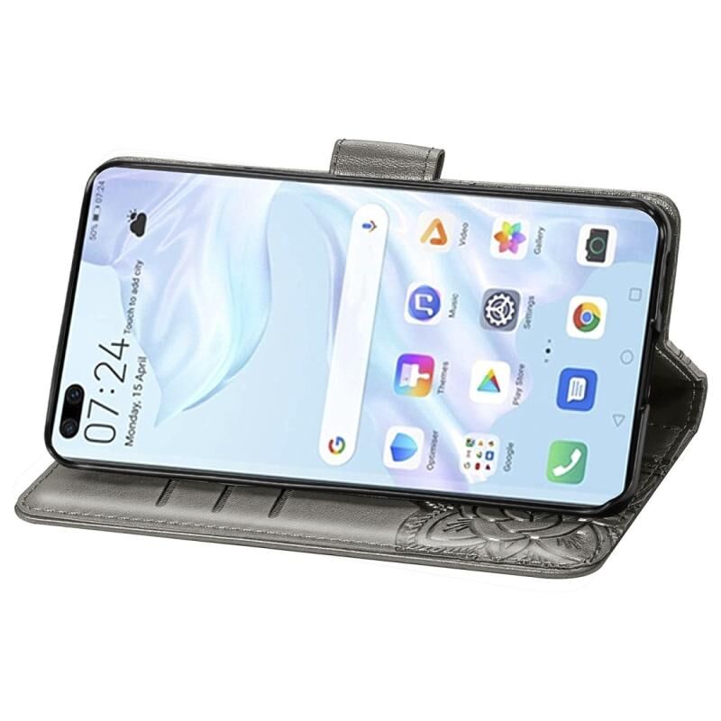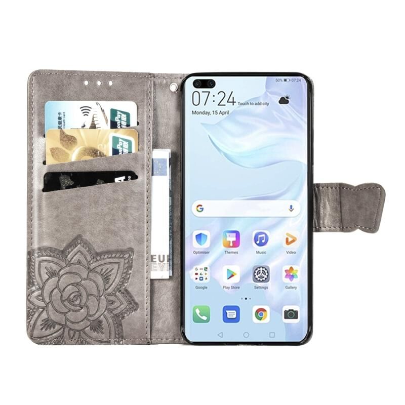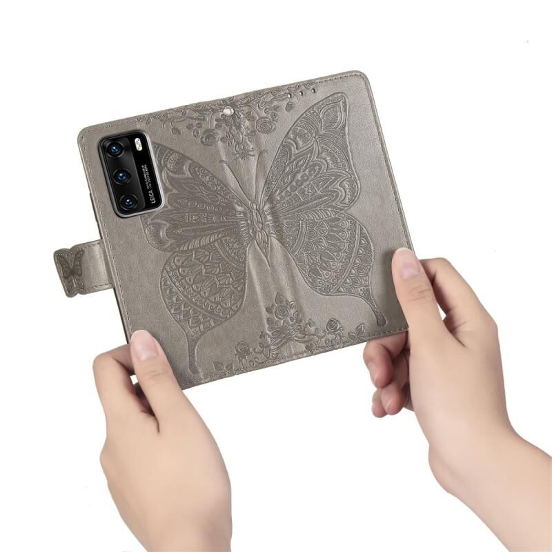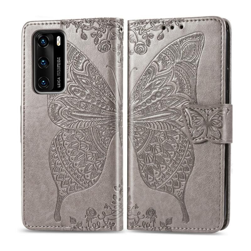 Θήκη Huawei P40 Butterfly Love Flower Embossed Οριζόντια Δερμάτινη με Στήριγμα / Θήκη Κάρτας / Πορτοφόλι / Λουρί (Γκρι)