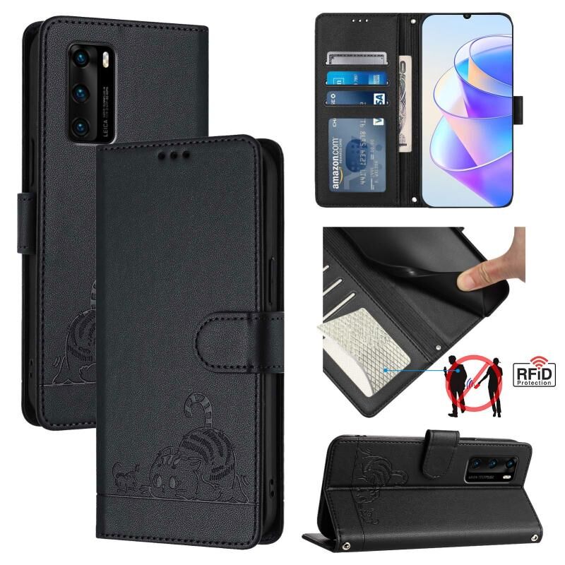 Θήκη τηλεφώνου Huawei P40 με ανάγλυφο σχέδιο γάτας και ποντικιού, δερμάτινη με λουρί (Μαύρο)