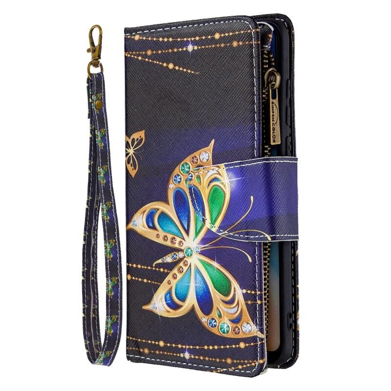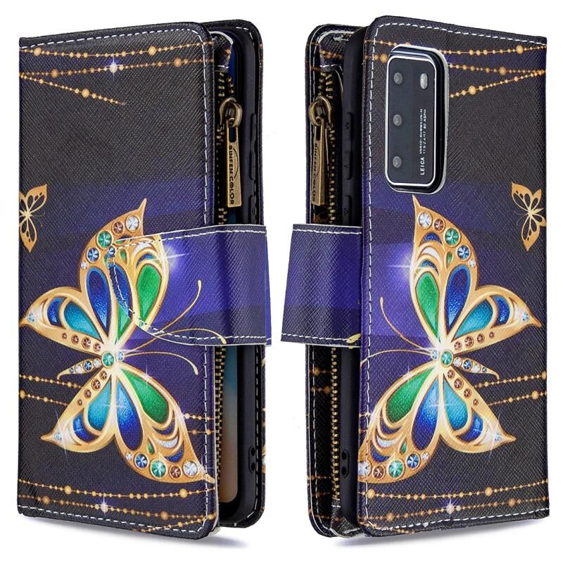Θήκη Huawei P40 με έγχρωμο σχέδιο, οριζόντια αναδιπλούμενη από δέρμα με φερμουάρ, βάση στήριξης & θήκες για κάρτες & πορτοφόλι (Πεταλούδα)