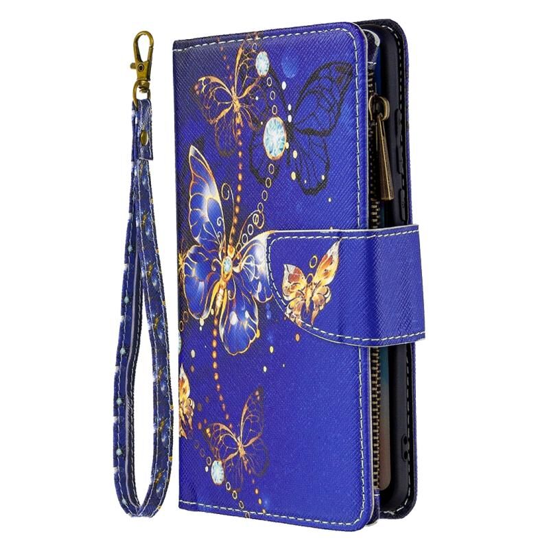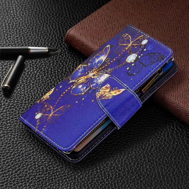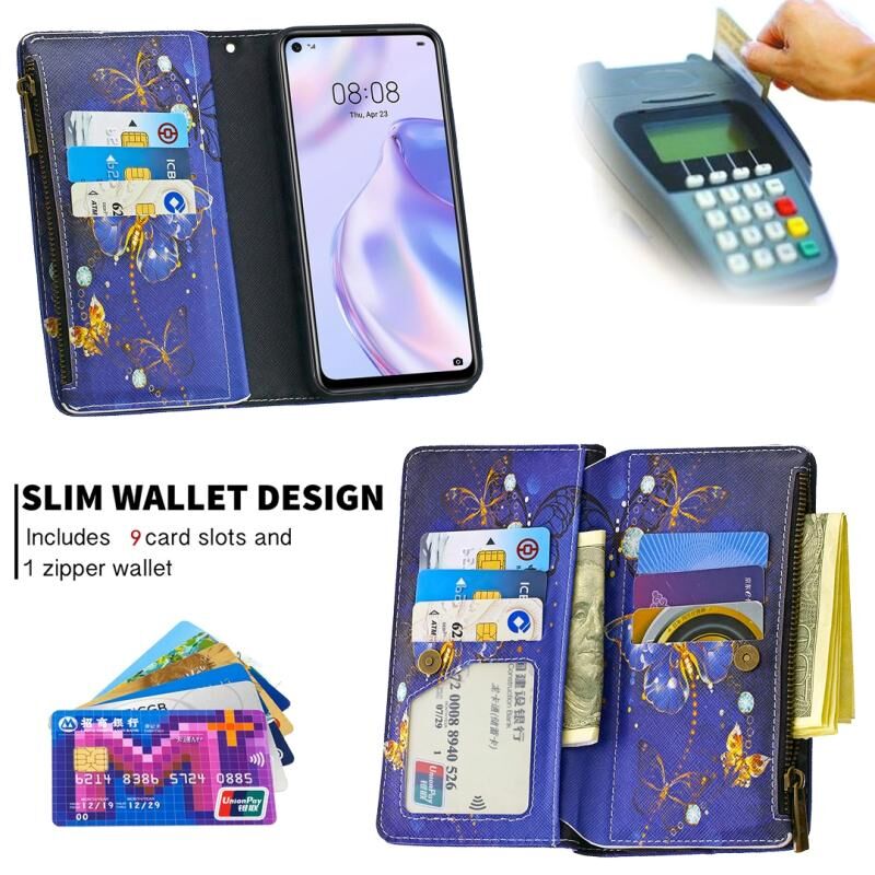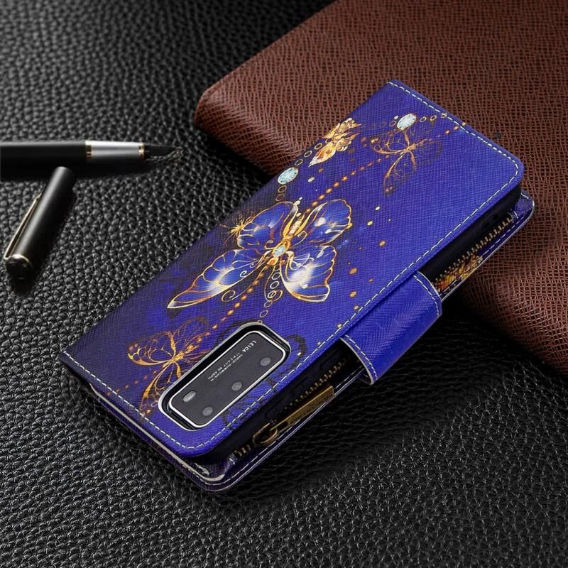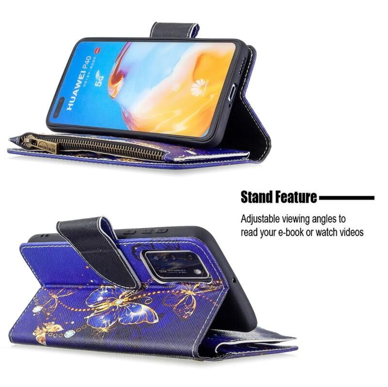 Θήκη Huawei P40 με έγχρωμο σχέδιο, οριζόντια αναδιπλούμενη από δέρμα με φερμουάρ, βάση στήριξης & θήκες για κάρτες & πορτοφόλι (Μωβ Πεταλούδα)