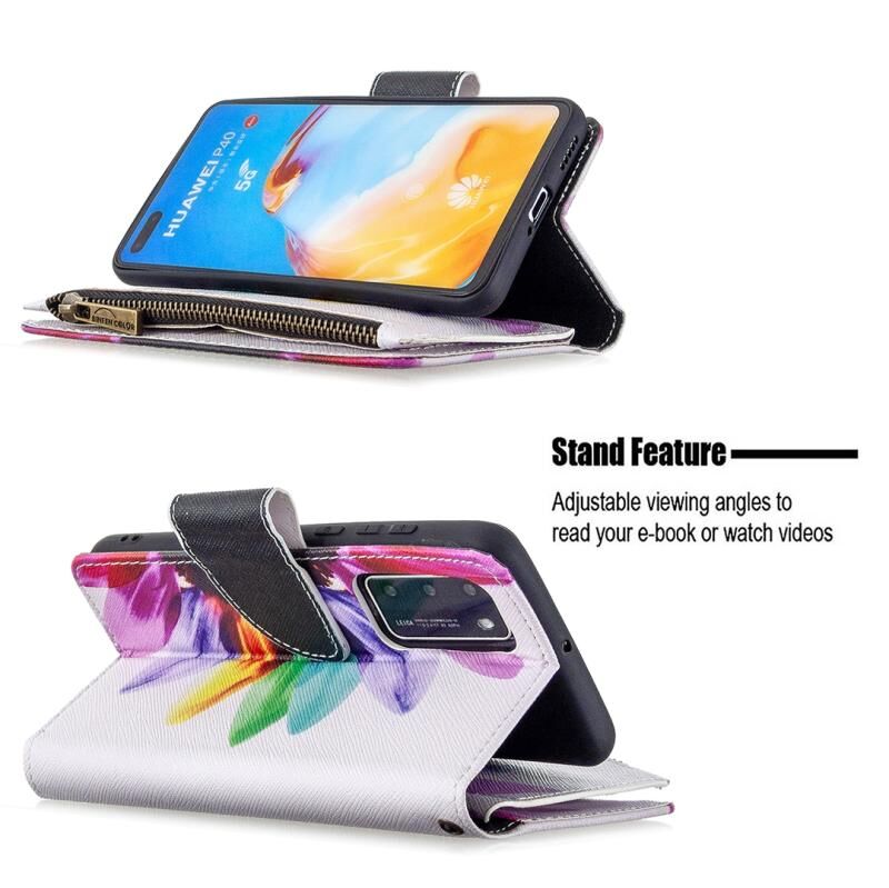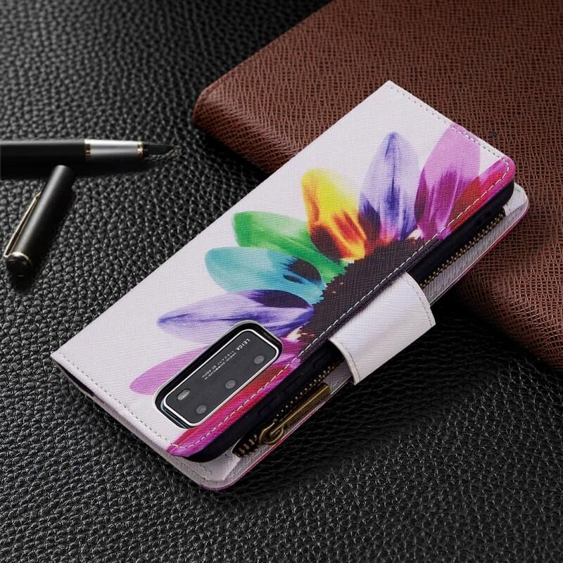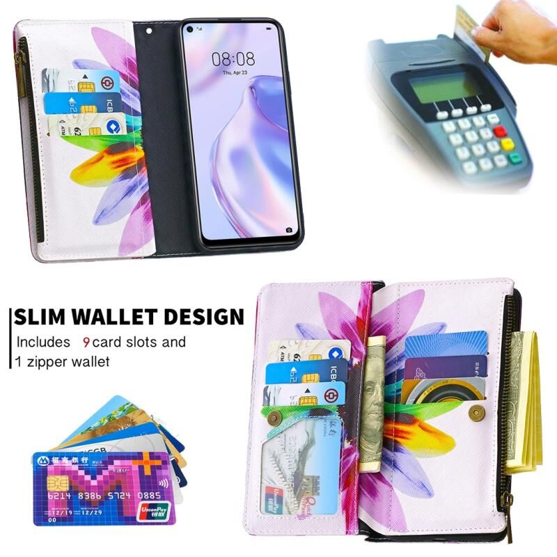 Θήκη Huawei P40 με έγχρωμο σχέδιο, οριζόντια αναδιπλούμενη από δέρμα με φερμουάρ, βάση στήριξης & θήκες για κάρτες & πορτοφόλι (Ηλίανθος)