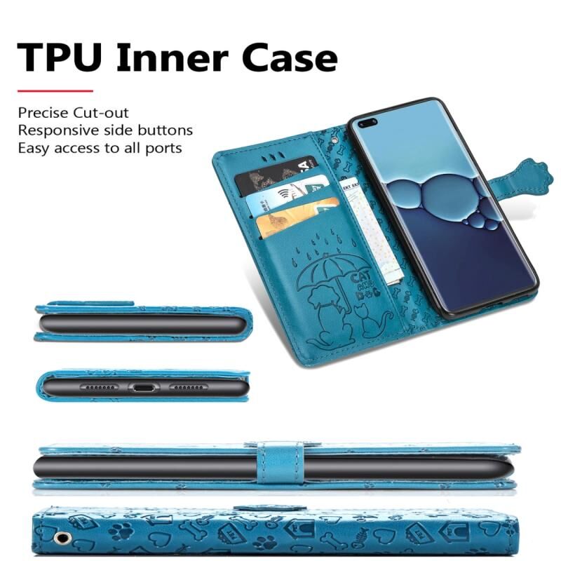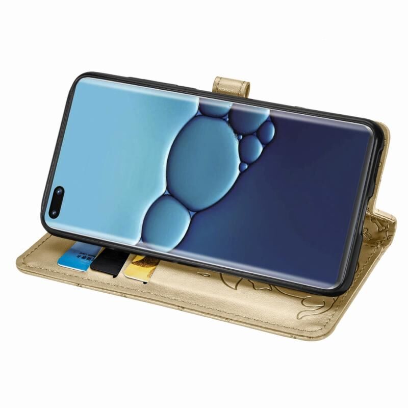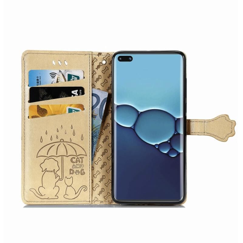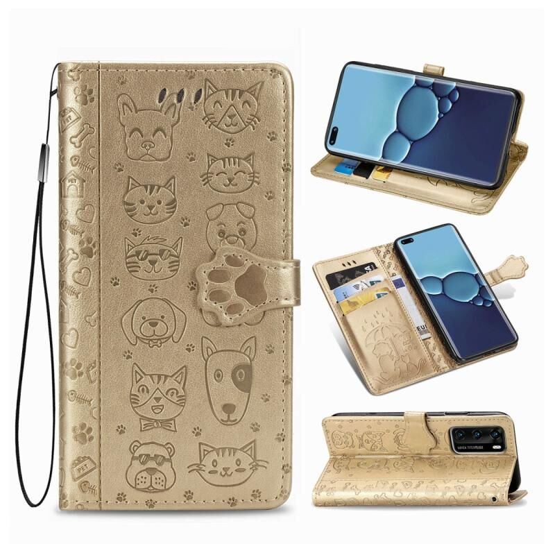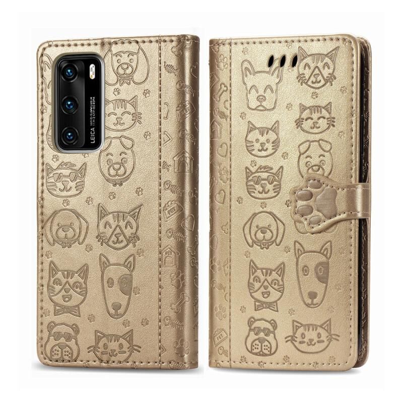 Θήκη δέρματος οριζόντιας αναδίπλωσης για Huawei P40 με χαριτωμένα ανάγλυφα σχέδια γάτας και σκύλου, με βάση / υποδοχή κάρτας / πορτοφόλι / κορδόνι (Χρυσός)