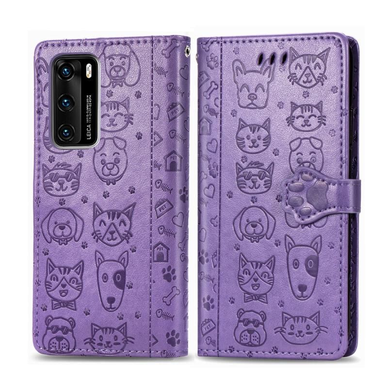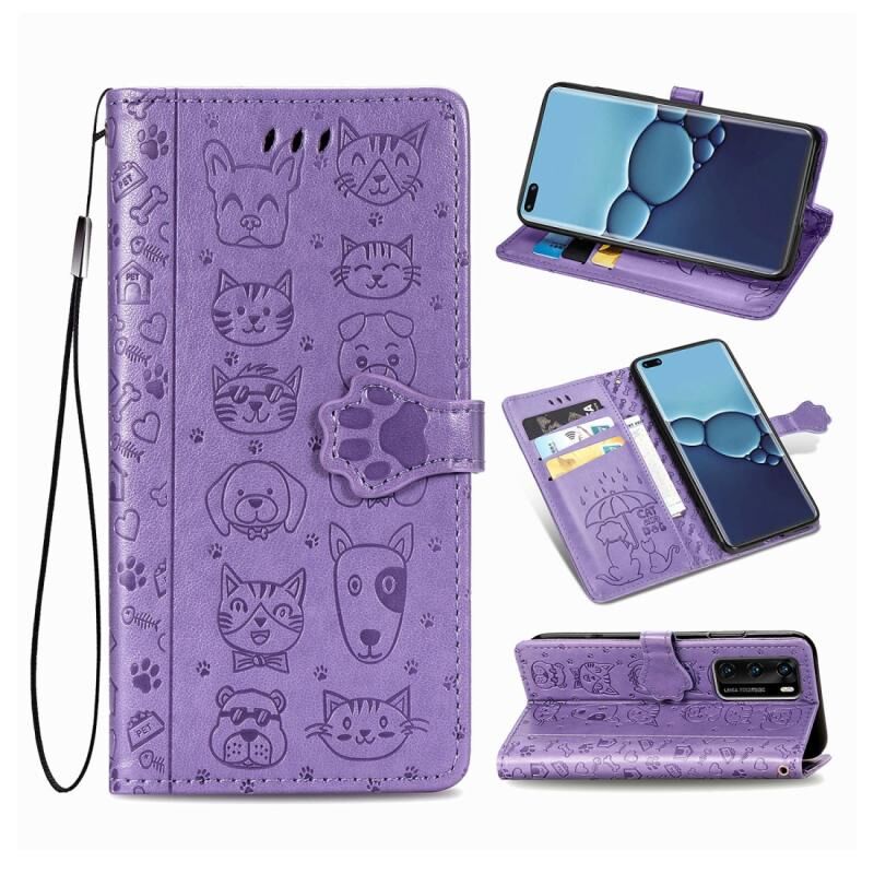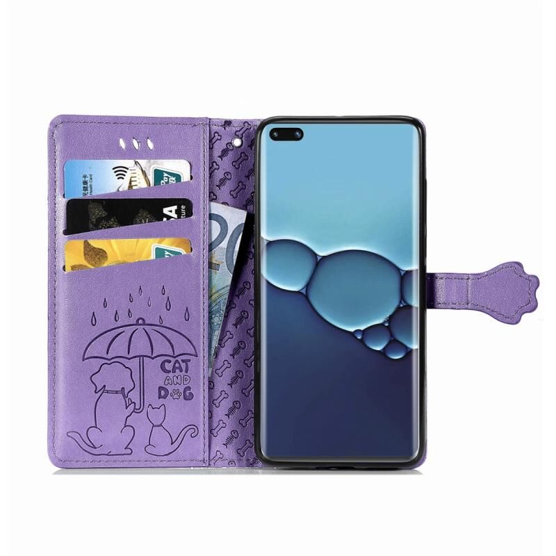 Θήκη Huawei P40 με χαριτωμένο ανάγλυφο σχέδιο γάτας και σκύλου, οριζόντια, από δέρμα με βάση / υποδοχή κάρτας / πορτοφόλι / κορδόνι (Κίτρινο)