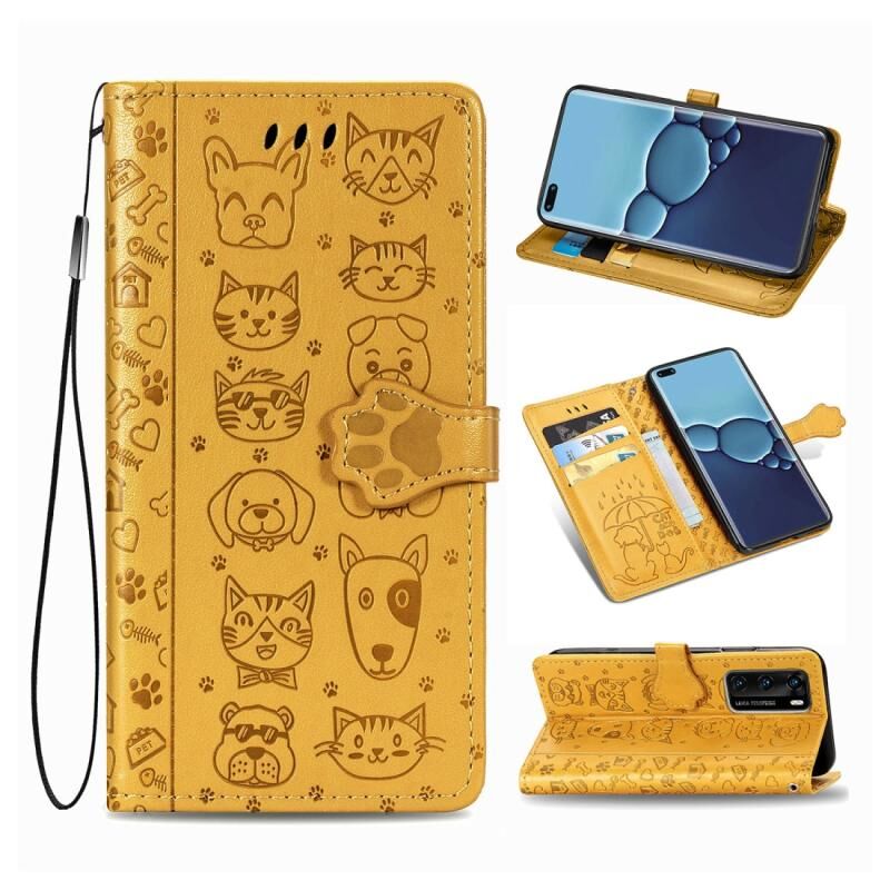 Θήκη Huawei P40 με χαριτωμένο ανάγλυφο σχέδιο γάτας και σκύλου, οριζόντια, από δέρμα με βάση / υποδοχή κάρτας / πορτοφόλι / κορδόνι (Κίτρινο)