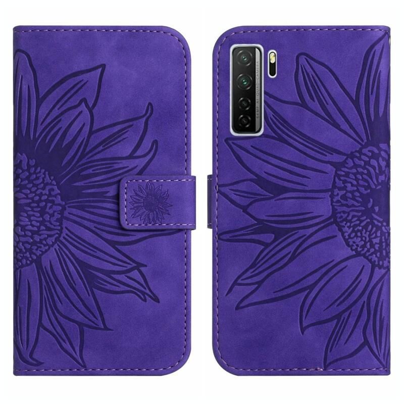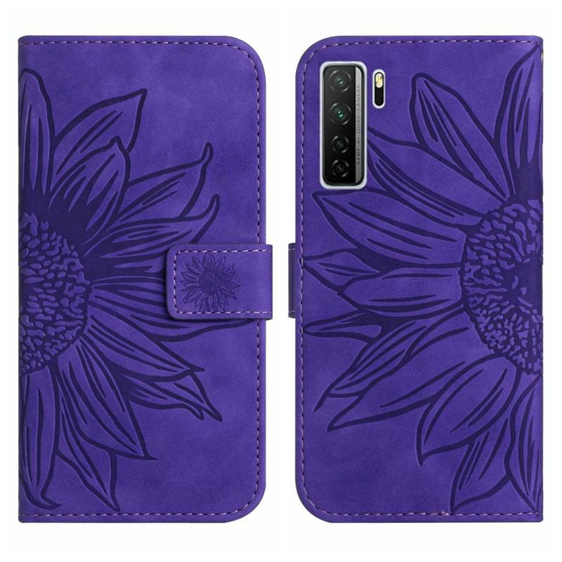 Θήκη τηλεφώνου Huawei P40 Lite 5G με δερμάτινη υφή, σχέδιο ηλίανθου, τύπου flip με κορδόνι (Σκούρο μωβ)