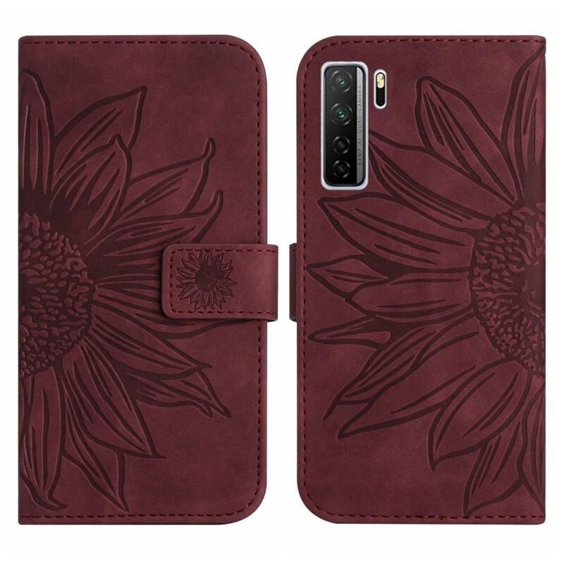 Θήκη τηλεφώνου Huawei P40 Lite 5G με δερμάτινη υφή, σχέδιο ηλίανθου, τύπου flip με κορδόνι (Κρασοκόκκινο)