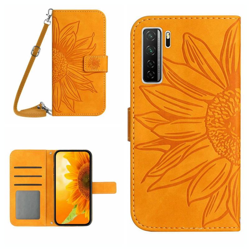 Θήκη τηλεφώνου Huawei P40 Lite 5G με δερμάτινη υφή, σχέδιο ηλίανθου, τύπου flip με κορδόνι (Κίτρινο)
