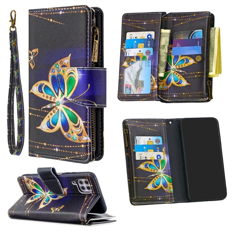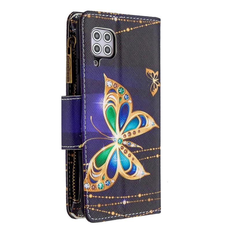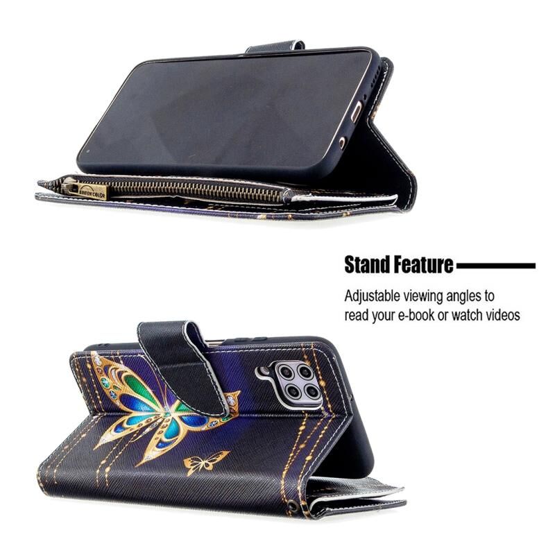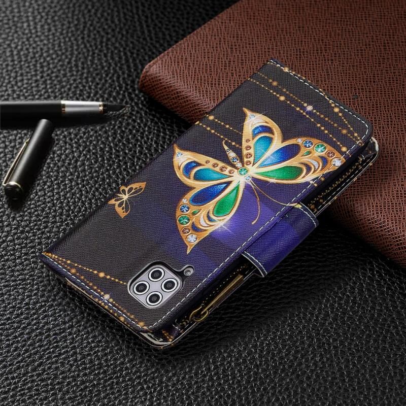 Θήκη Huawei P40 Lite με έγχρωμο σχέδιο, οριζόντια αναδιπλούμενη από δέρμα με φερμουάρ, βάση στήριξης & θήκες για κάρτες & πορτοφόλι (Μεγάλη Πεταλούδα)