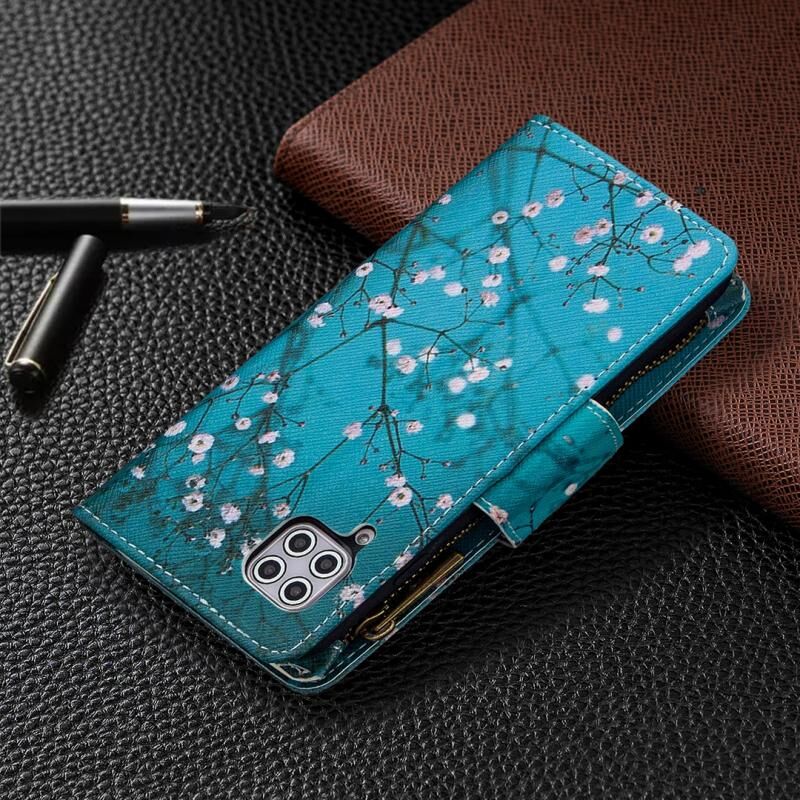 Θήκη Huawei P40 Lite με έγχρωμο σχέδιο, οριζόντια αναδιπλούμενη από δέρμα με φερμουάρ, βάση στήριξης & θήκες για κάρτες & πορτοφόλι (Λουλούδι Δαμασκηνιάς)