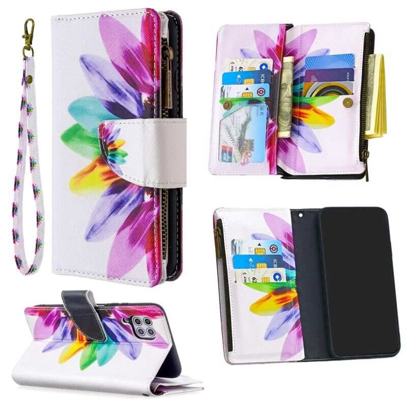 Θήκη Huawei P40 Lite με έγχρωμο σχέδιο, οριζόντια αναδιπλούμενη από δέρμα με φερμουάρ, βάση στήριξης & θήκες για κάρτες & πορτοφόλι (Ηλίανθος)
