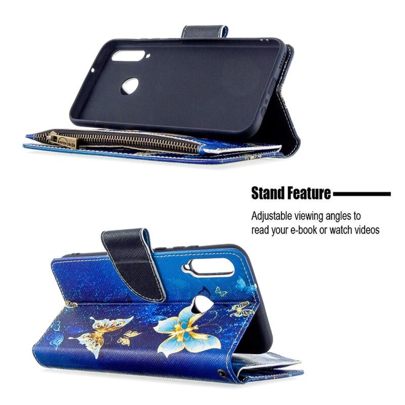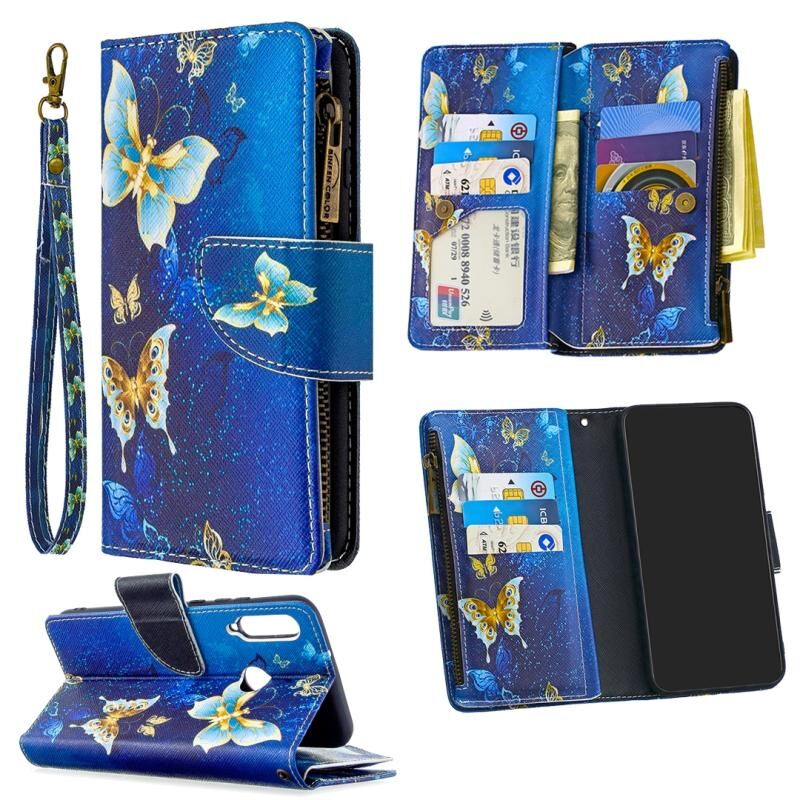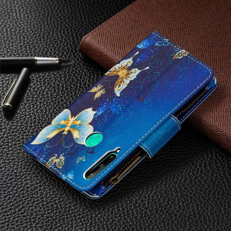 Θήκη δέρματος οριζόντιας αναδίπλωσης με φερμουάρ και σχέδιο ζωγραφικής για Huawei P40 Lite E / Y7p με βάση για κάρτες και πορτοφόλι (Χρυσή Πεταλούδα)
