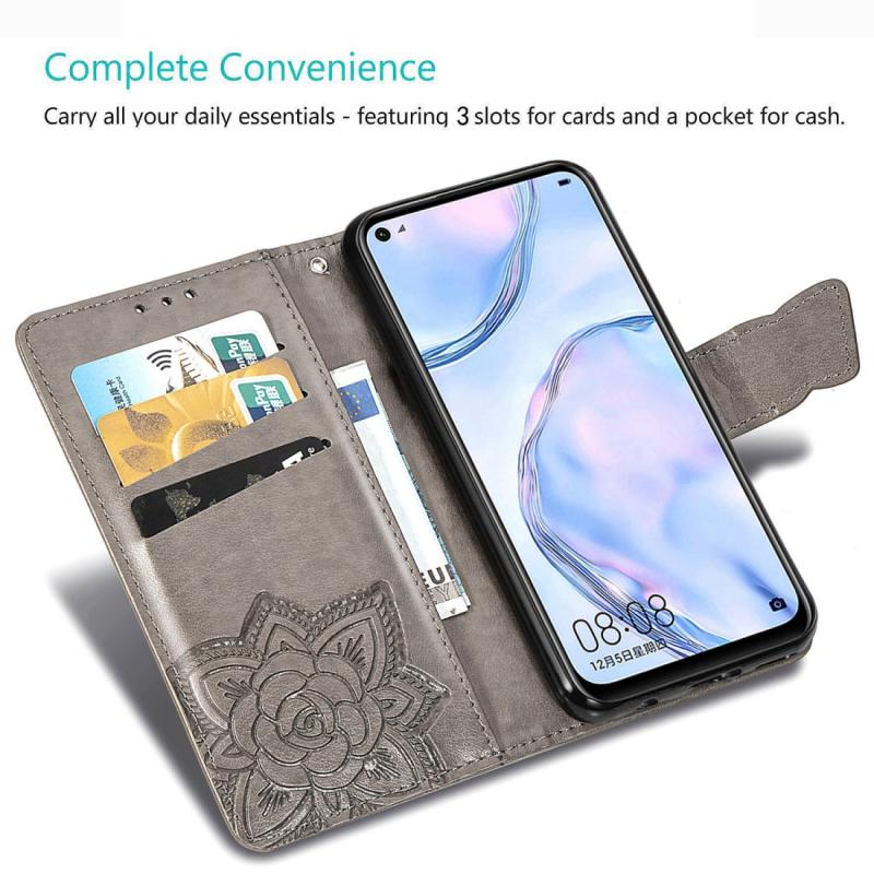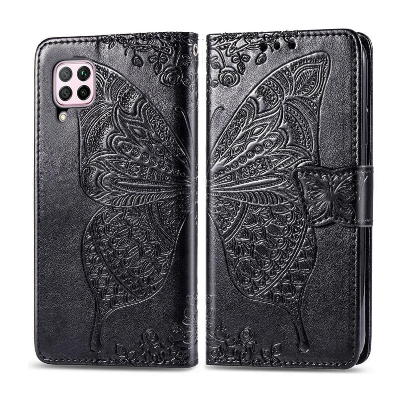 Θήκη δέρματος οριζόντιας αναδίπλωσης με ανάγλυφο σχέδιο πεταλούδας και λουλουδιών για Huawei P40 Lite/Nova 7i/Nova 6SE, με βάση στήριξης / υποδοχή κάρτας / πορτοφόλι / κορδόνι (Μαύρο)
