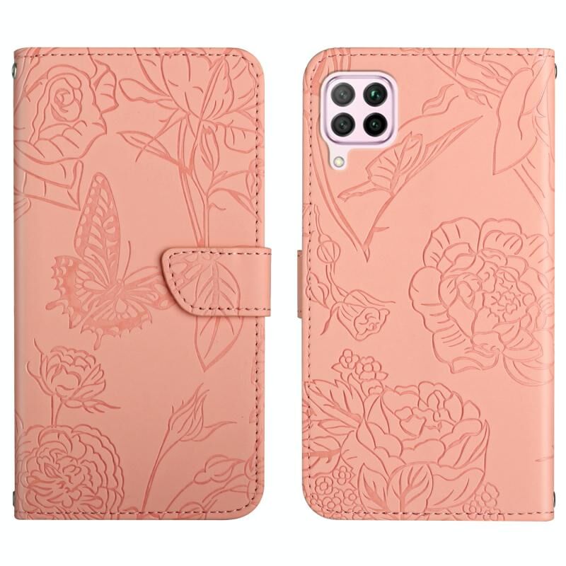Θήκη τηλεφώνου Huawei P40 Lite με ανάγλυφο σχέδιο πεταλούδας και παιώνιας, δερμάτινη υφή (ρόζ)