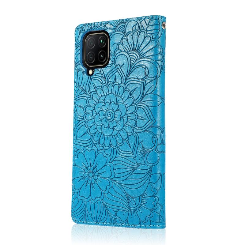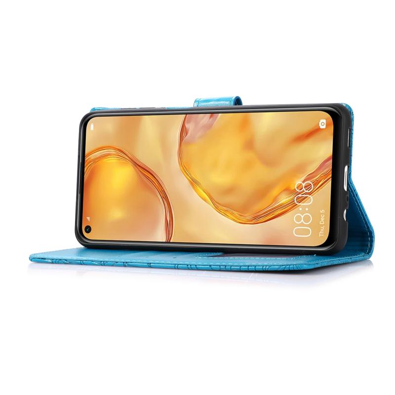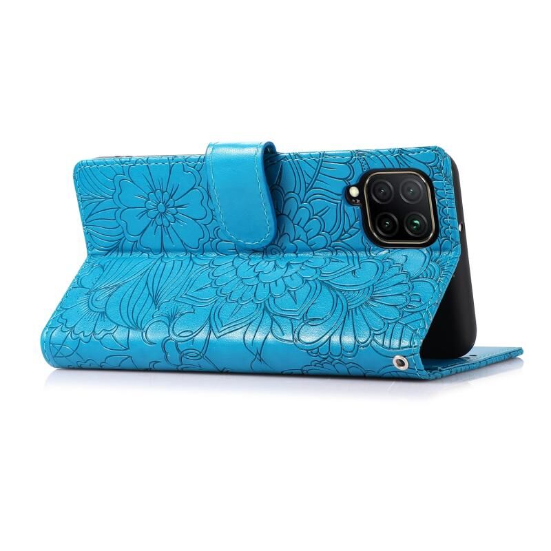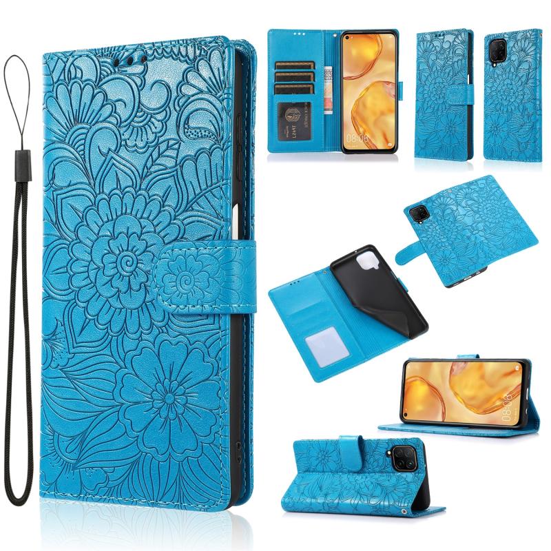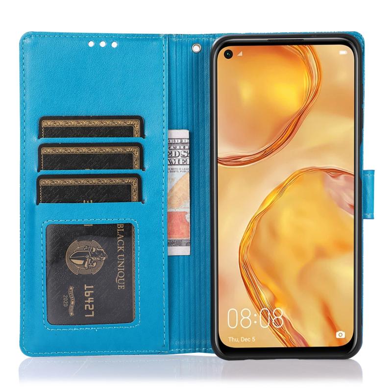 Θήκη Huawei P40 lite με υφή δέρματος, ανάγλυφο ηλιοτρόπιο, οριζόντια, δερμάτινη με βάση στήριξης, θήκες καρτών, πορτοφόλι & λουρί (Μαύρο)