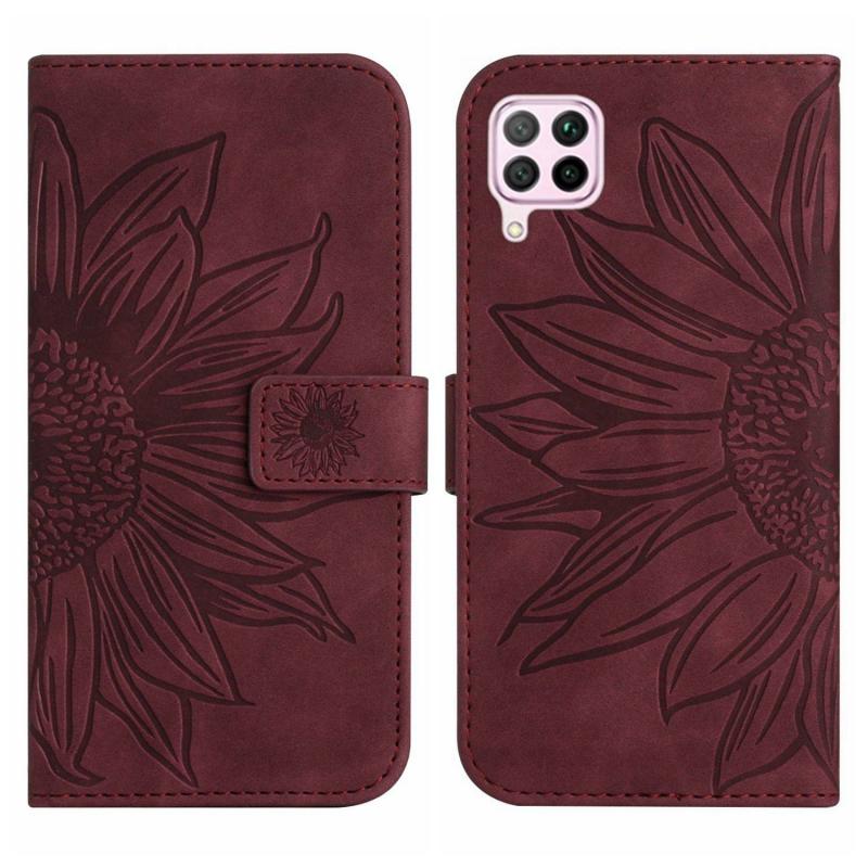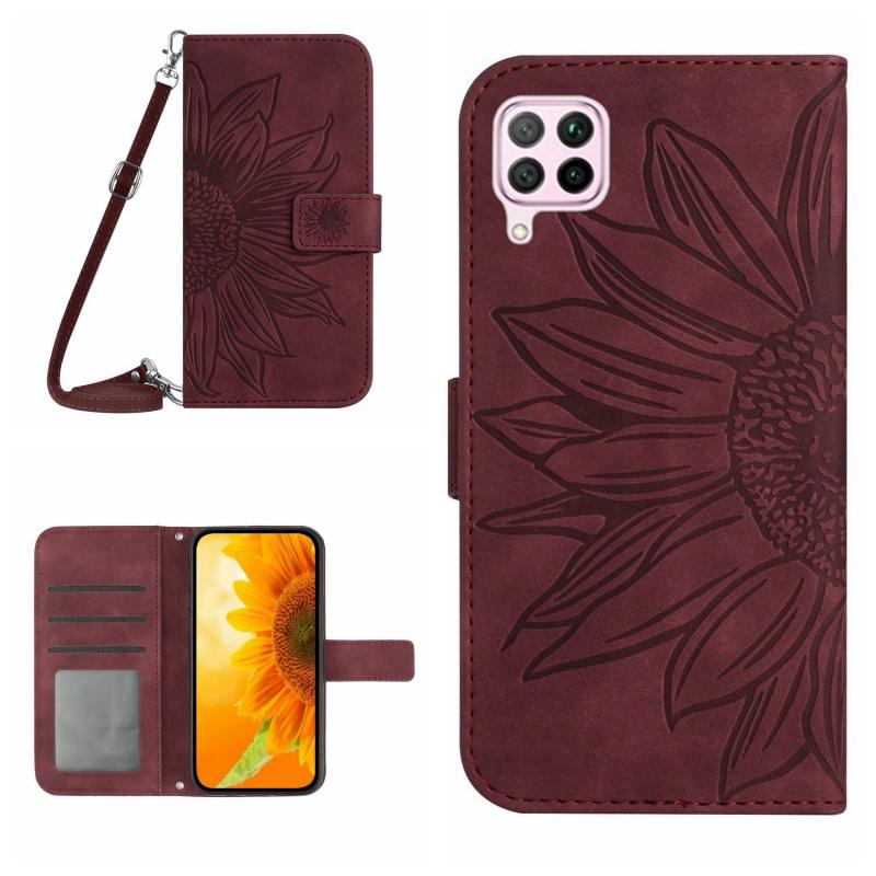 Θήκη τηλεφώνου Huawei P40 Lite με αίσθηση δέρματος, σχέδιο ηλίανθου, τύπου flip με λουρί (Σκούρο Μωβ)