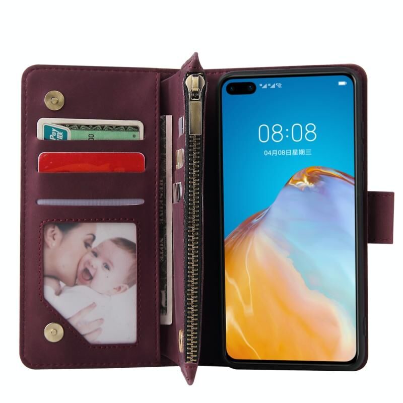 Για το Huawei P40 Πολυλειτουργική οριζόντια Flip δερμάτινη θήκη, με υποδοχή για κάρτες & θήκη για κάρτες & φερμουάρ πορτοφόλι & κορνίζα φωτογραφιών (κόκκινο κρασί)