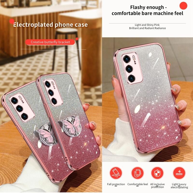 Θήκη κινητού τηλεφώνου Huawei P40 με επιμετάλλωση, διαβαθμισμένη λάμψη, σχέδιο πεταλούδας, από TPU (Ροζ)