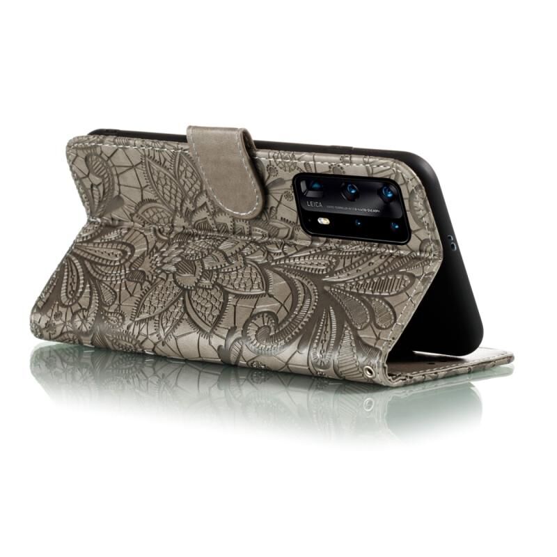 Θήκη δέρματος οριζόντιας αναδίπλωσης με ανάγλυφο σχέδιο δαντέλας λουλουδιών για Huawei P40 Pro Plus, με βάση στήριξης & υποδοχές καρτών & πορτοφόλι & κορνίζα φωτογραφιών & κορδόνι (Μαύρο)
