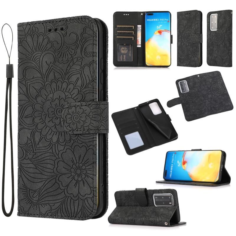 Για το Huawei P40 Pro Skin Feel ανάγλυφο ηλιοτρόπιο οριζόντια Flip δερμάτινη θήκη με υποδοχές για κάρτες και πορτοφόλι και κορδόνι (Μαύρο)