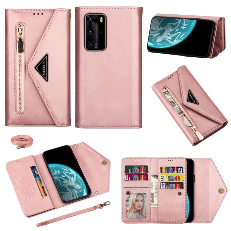 Θήκη Huawei P40 Pro με υφή δέρματος, οριζόντια, με φερμουάρ, με θήκη, υποδοχές καρτών, κορνίζα φωτογραφιών, κορδόνι και μακρύ σχοινί (Μαύρο)