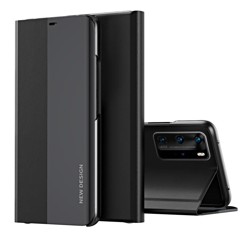 Θήκη δέρματος οριζόντιας αναδίπλωσης με ηλεκτρολυτική επίστρωση και βάση στήριξης για Huawei P40 (Μαύρο)